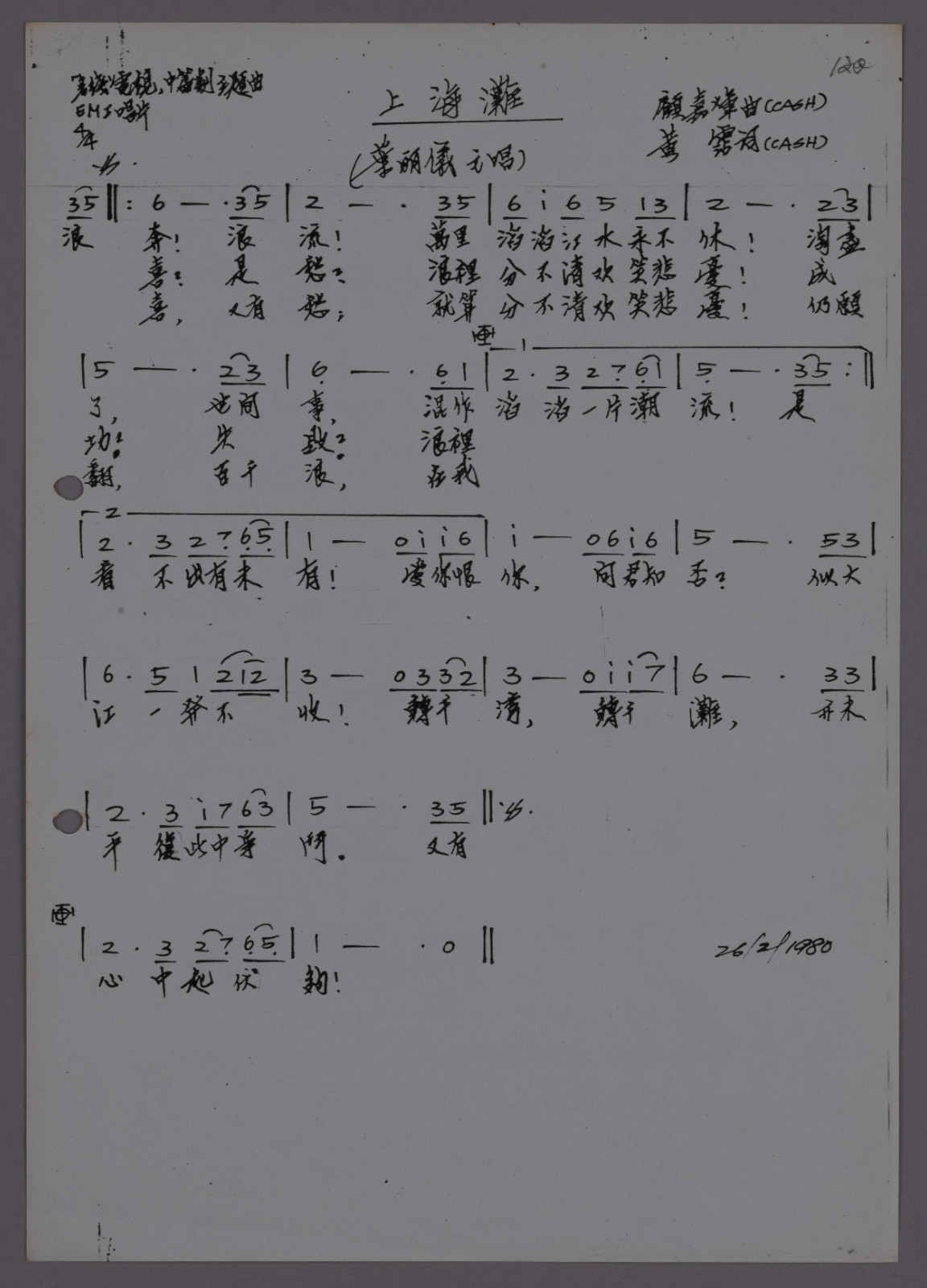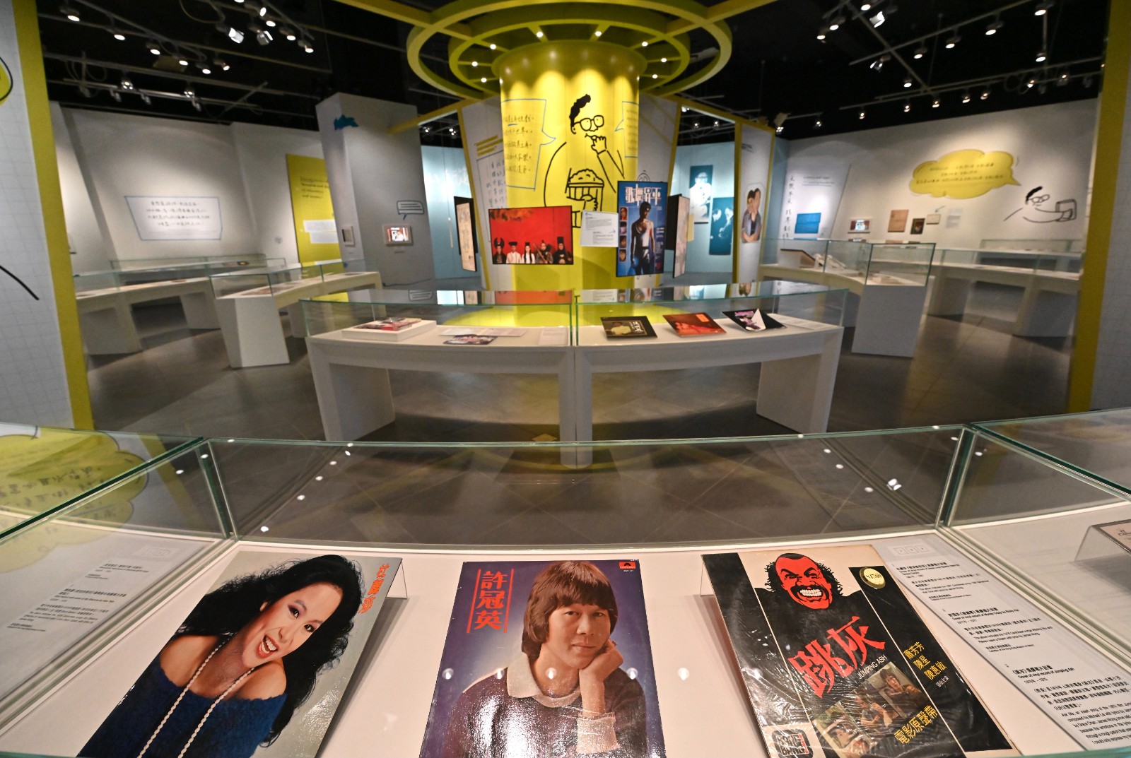 黃霑作為一代鬼才,不少經典歌曲出自他的手筆,展品包括多張珍貴的唱片封套,如收錄了由黃霑填詞、其音樂創(chuàng)作好拍檔顧嘉煇作曲、港人耳熟能詳?shù)摹丢{子山下》;由黃霑為經典兒歌填上粵語歌詞的《世界真細小》等。其中同樣是「煇黃」組合作品的《上海灘》電視劇主題曲歌詞手稿由黃霑家人借出,據(jù)陳館長介紹,這首家喻戶曉的歌曲是兩人透過電話溝通合作:「黃霑創(chuàng)作《上海灘》時非常倉促,在電話中,顧嘉煇哼音樂,黃霑筆錄填詞,再唱給顧嘉煇聽。黃霑曾提過,寫歌時填了開首的『浪奔、浪流』後花了二十分鐘就填好詞,事後他說自己從未去過黃浦江,『浪奔、浪流』是他自己的想像,反映了黃霑的文筆、中文造詣之高。」陳館長並提醒,現(xiàn)時展覽展示的為複製品,原稿在博物館另一展覽「瞧潮香港 60+」中展示。