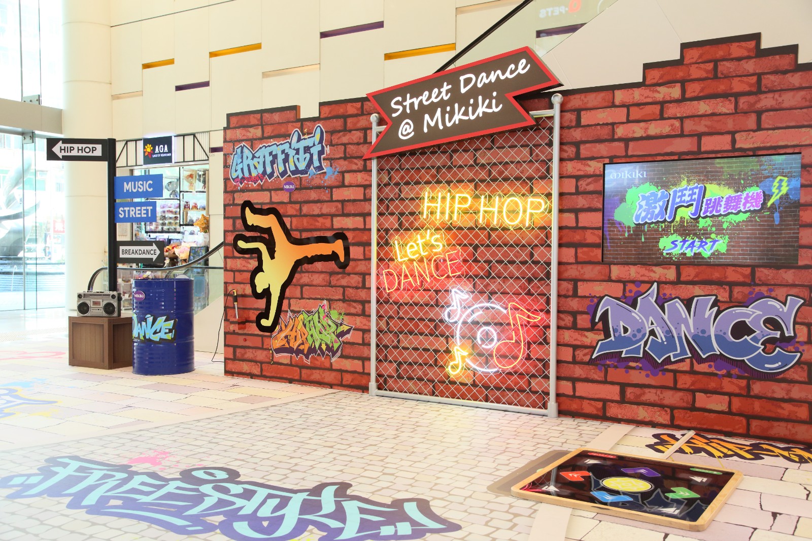 來到商場中庭B區(qū),酷炫街頭風的打卡牆設(shè)有兩款互動遊戲可供挑戰(zhàn)。包括舞者電流棒及激鬥跳舞機,前者玩家需手眼並用,以電流棒沿著霹靂舞「Freeze」動作圖案完成遊戲,過程刺激緊張,考驗反應(yīng)力;後者跟隨節(jié)奏,踩對不同方向的箭咀,搭配閃爍燈光及嘻哈音樂,彷彿正進行街舞比拼。