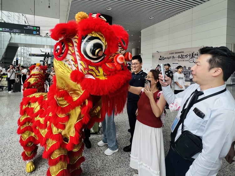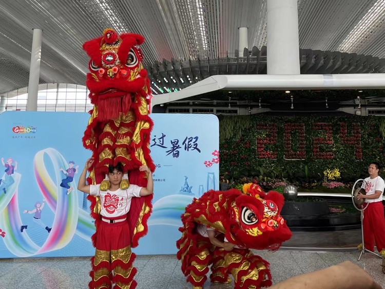 作為嶺南最具代表性的非遺表演,醒獅在白雲(yún)機(jī)場出發(fā)廳與旅客們來了個「零距離接觸」,兼具十足的觀賞性和互動性。特別是現(xiàn)場的小朋友們,與生龍活虎醒獅打成一片,歡聲笑語讓人感受到廣東夏日活力。來自山東的旅客王先生說:「一直在網(wǎng)上看到廣東的醒獅、英歌舞很熱鬧很火爆,小朋友很喜歡,所以特地帶小朋友到廣東過暑假,沒想到在機(jī)場就看到了,很驚喜!」別開生面的演出為旅客們的旅途增添了難忘的回憶。