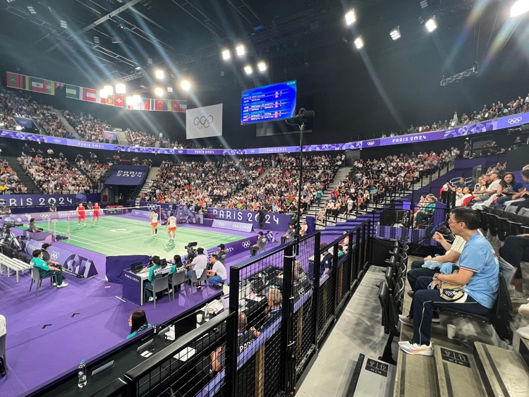 楊潤雄(右一)觀看2024巴黎奧運(yùn)羽毛球女子雙打賽事。(政府新聞處)