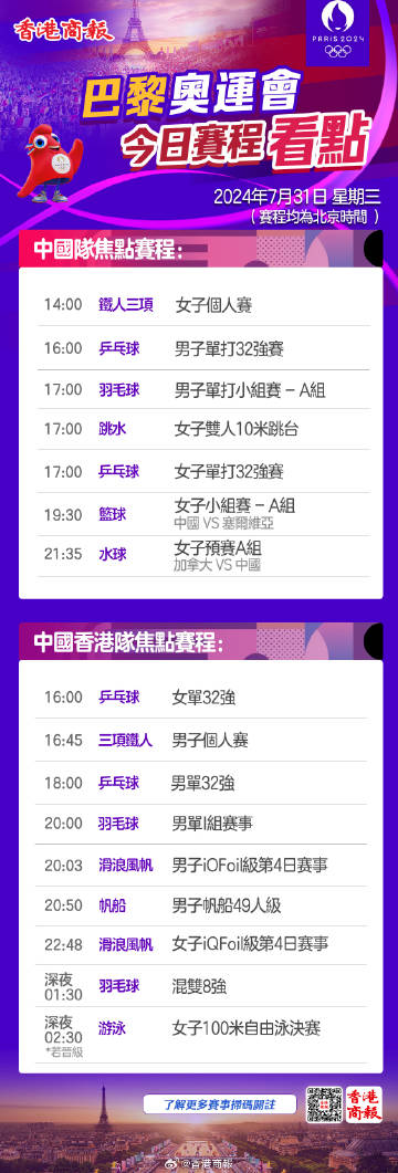 北京時(shí)間7月31日,巴黎奧運(yùn)會(huì)進(jìn)行第5個(gè)比賽日,今日將會(huì)產(chǎn)生18枚金牌,中國隊(duì)在這個(gè)比賽日有多個(gè)衝金點(diǎn):跳水——全紅嬋迎巴黎首秀,女雙10米臺(tái)力爭金牌;羽毛球——小組賽迎來收官,混雙淘汰賽國羽內(nèi)戰(zhàn);籃球——中國女籃迎關(guān)鍵之戰(zhàn)。另外,中國香港隊(duì)將繼續(xù)有多個(gè)項(xiàng)目出賽:游泳——何詩蓓100米自由泳決賽,再次衝擊獎(jiǎng)牌;羽毛球——鄧俊文和謝影雪出戰(zhàn)混雙八強(qiáng);李卓耀出戰(zhàn)男單,爭小組首名出線;乒乓球——黃鎮(zhèn)廷和朱成竹將分別出戰(zhàn)男女單32強(qiáng),力爭晉級(jí)。