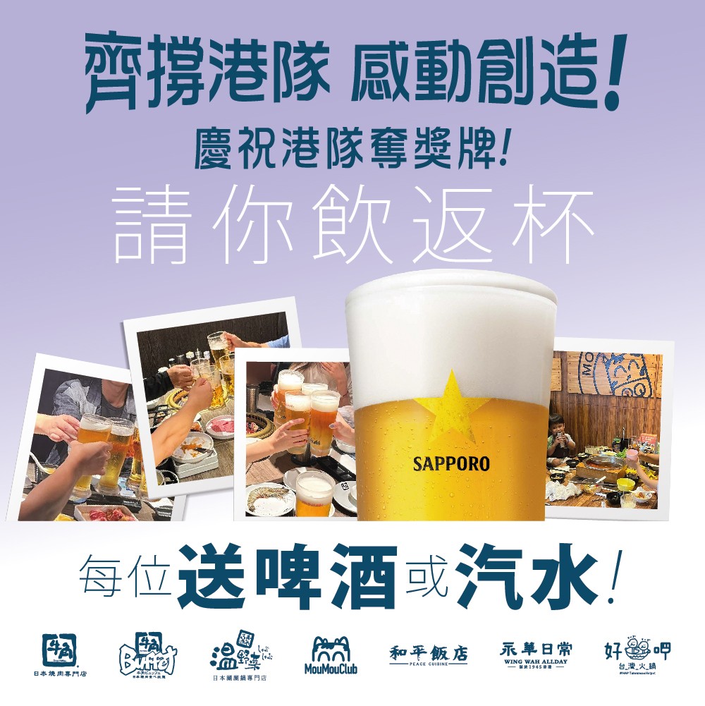 牛角昨日表示,慶祝港隊(duì)奪獎(jiǎng)牌,7月30日至31日到KABU分店免費(fèi)飲多杯,繼續(xù)撐港隊(duì)!