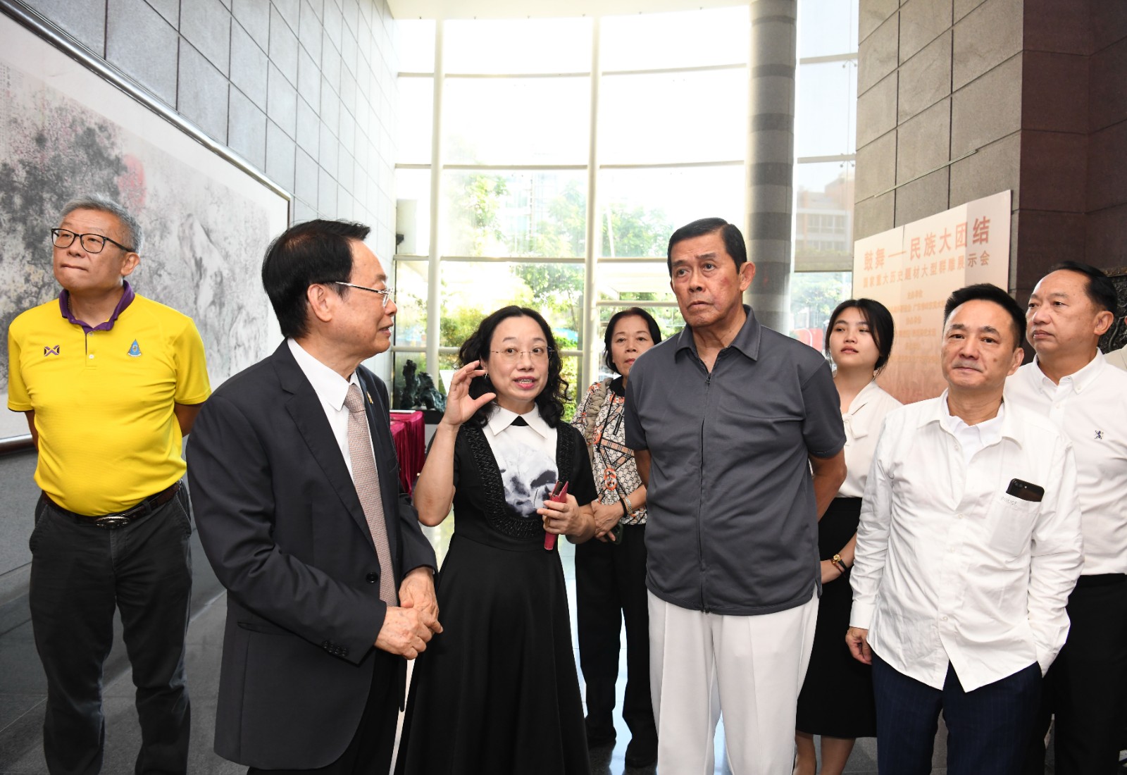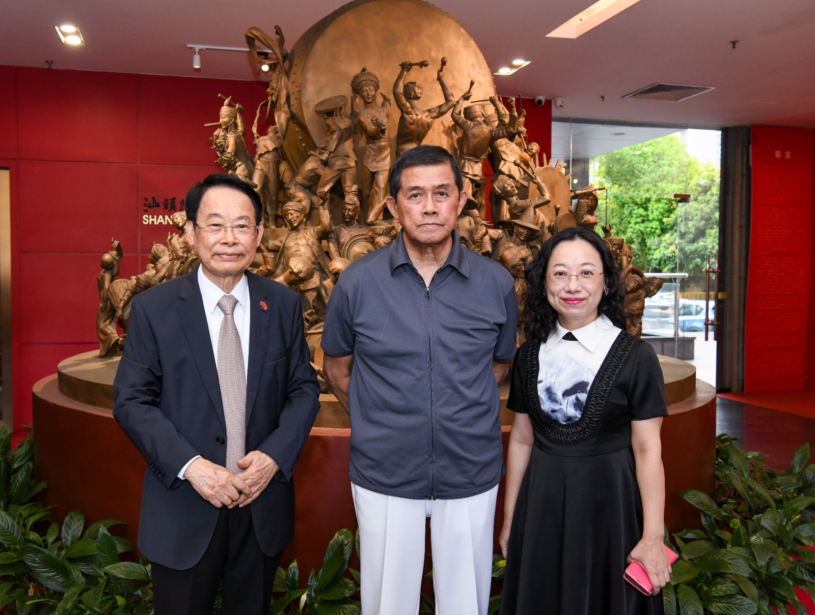 7月23日上午,功·塔帕朗西與蕭教授一同以特邀理事身份,出席汕頭市人民對(duì)外友好協(xié)會(huì)第五屆理事會(huì)成立大會(huì)。其後,來(lái)到藝苑文化廣場(chǎng)大堂,欣賞曹春生團(tuán)隊(duì)歷經(jīng)五年完成、為建國(guó)60周年創(chuàng)作的大型群雕《鼓舞——民族大團(tuán)結(jié)》,作品由56個(gè)中國(guó)民族、104個(gè)人物及100多件鼓樂(lè)道具組成,營(yíng)造了歡欣鼓舞之場(chǎng)面,功·塔帕朗西對(duì)作品展現(xiàn)的團(tuán)結(jié)祥和及繁榮盛世的表示讚賞。