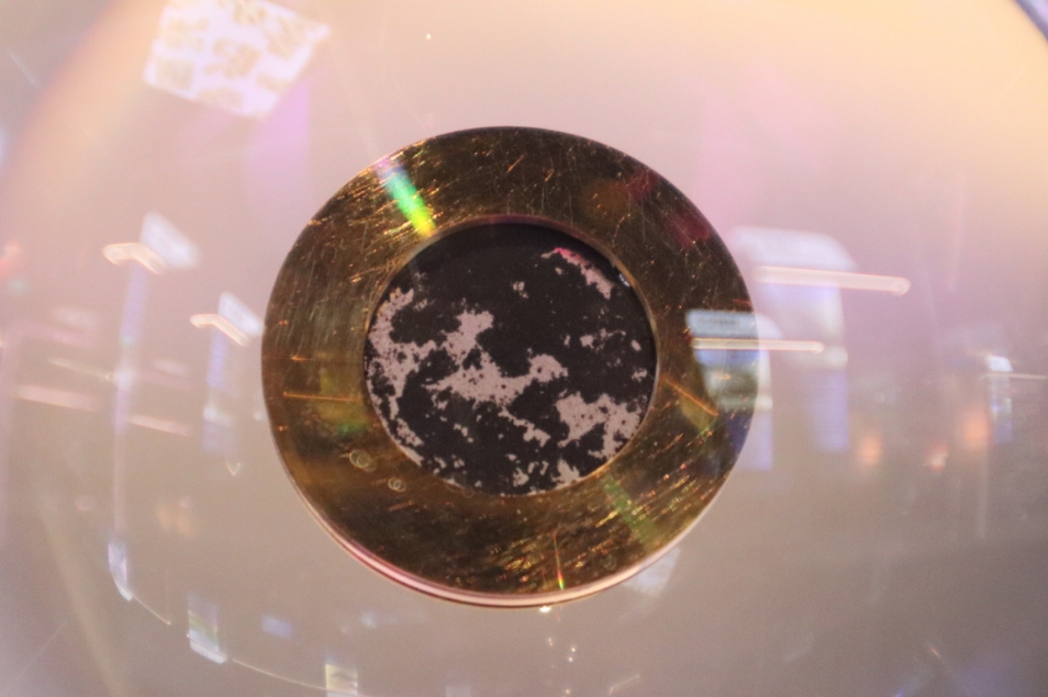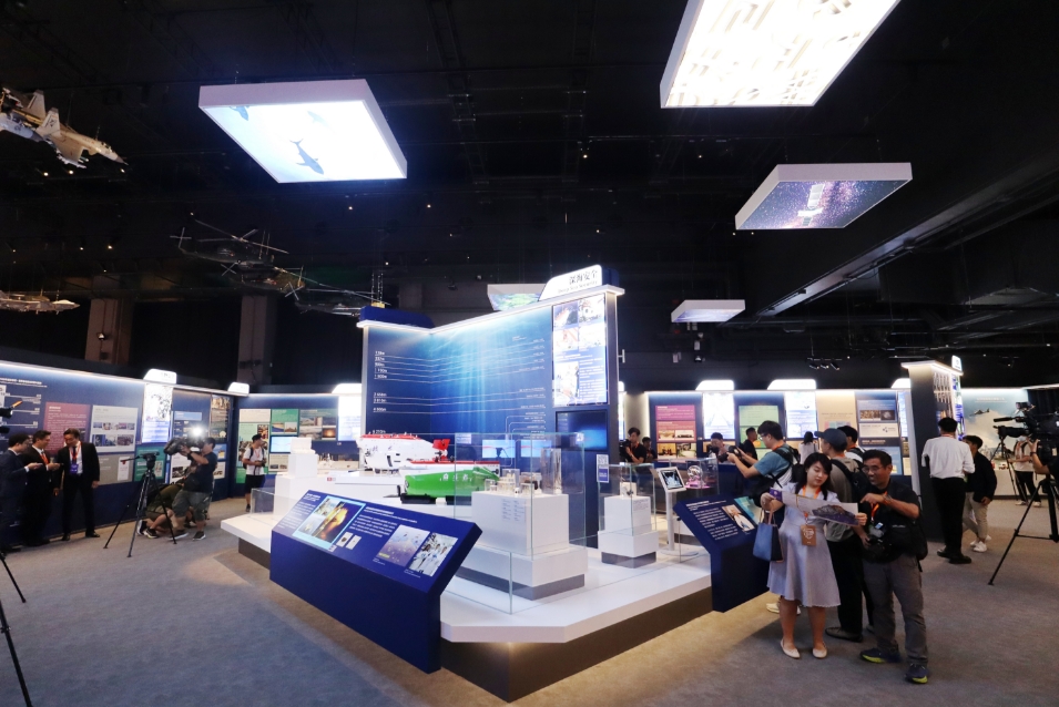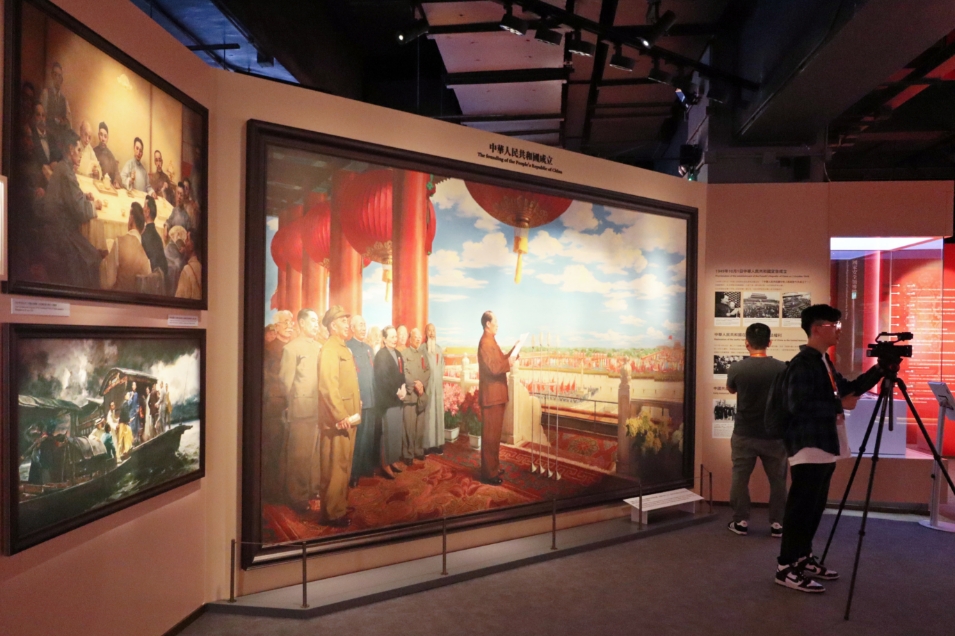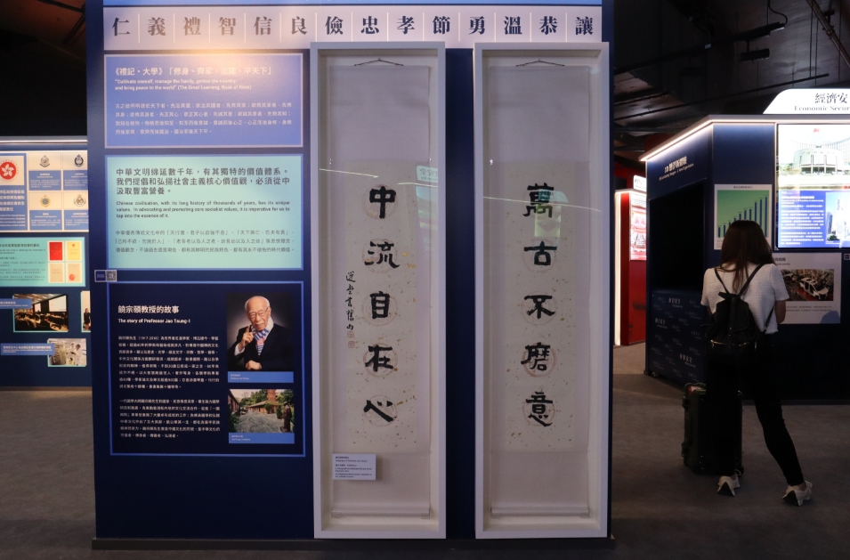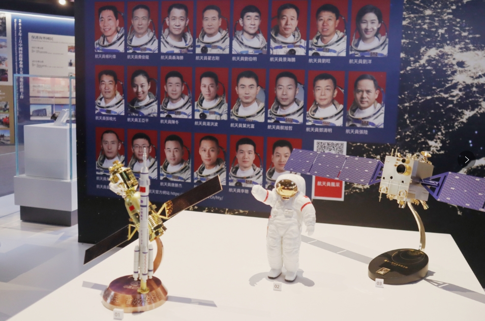 展品琳瑯滿目,除了展板的文字、圖片外,還有視頻、模型及實(shí)物,當(dāng)中有香港國安法公布實(shí)施當(dāng)日在天安門廣場飄揚(yáng)的國旗、「開國大典」油畫(官方複製品)丶高6米的長征五號B運(yùn)載火箭模型、月球土壤、火星相機(jī)模型等。(馮瀚文攝)