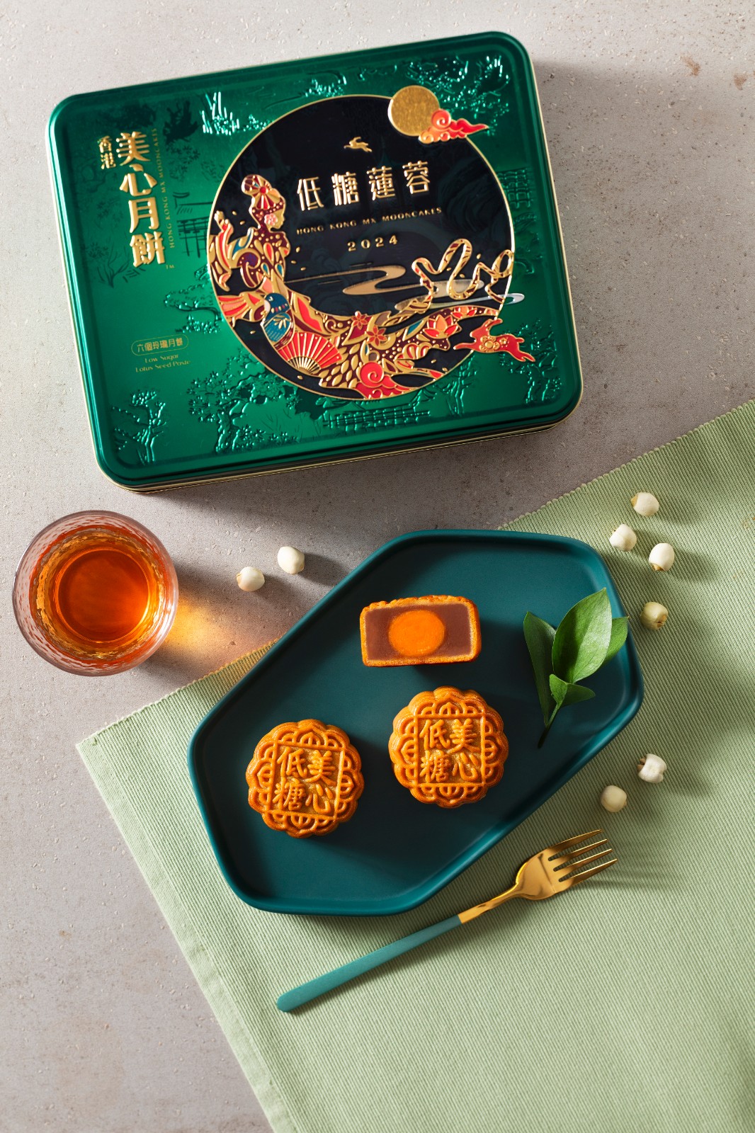 低糖蛋黃蓮蓉月餅,HK$409/盒(1盒6個),即日起至9月17日特價HK$265/盒,即日起至9月10日滙豐6折價HK$245.4/盒。