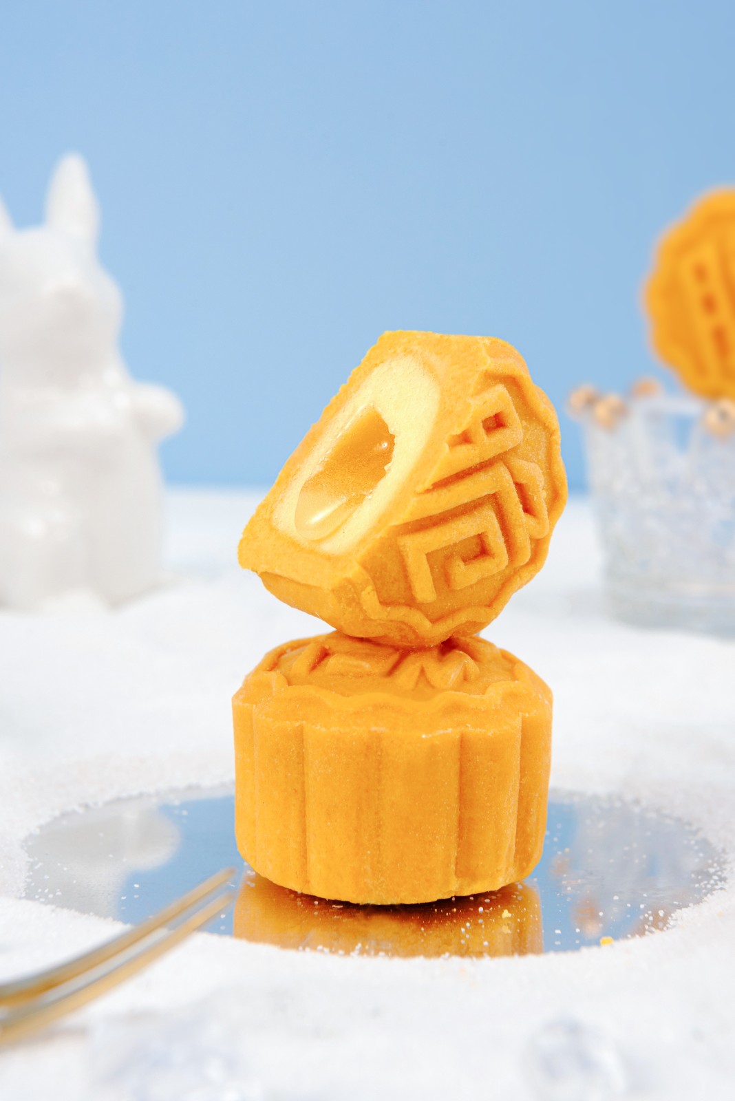脆皮海鹽芝士流心奶黃月餅外表金黃酥脆,內(nèi)餡加入海鹽,鹹甜交融。