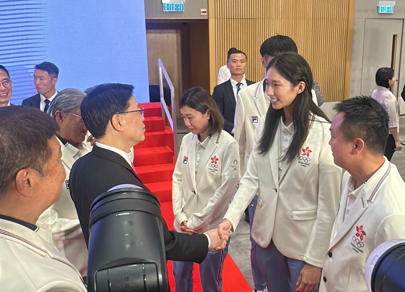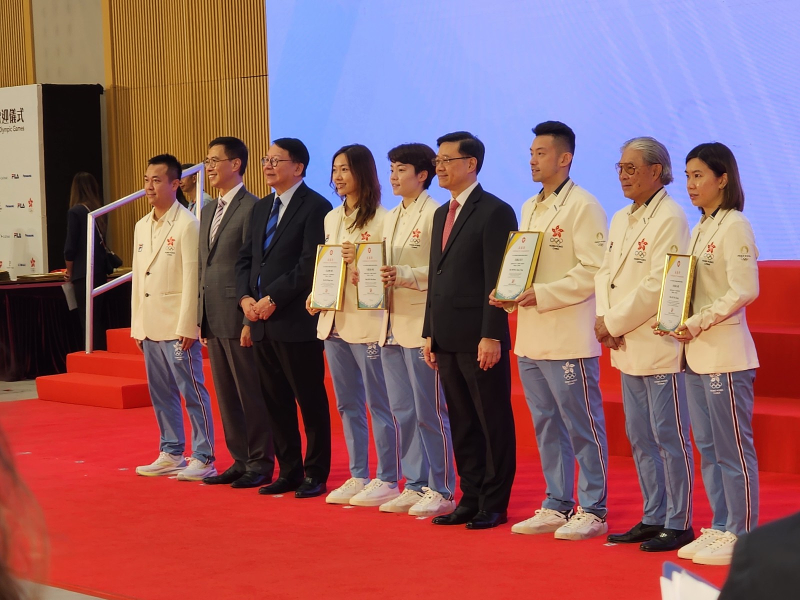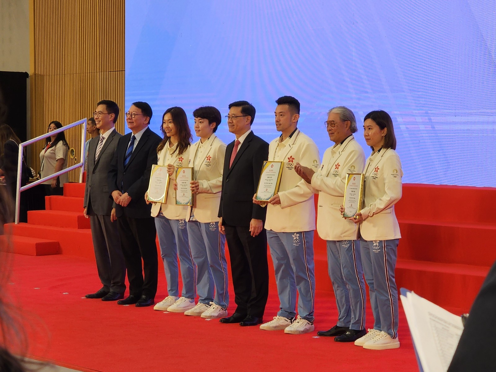 今屆巴黎奧運中國香港代表團(tuán)取得2金2銅歷史佳績,一眾運動員及代表團(tuán)成員今早(21日)巴士巡遊與巿民近距離接觸,並出席禮賓府歡迎午宴後,政府下午3時在政府總部舉行返港歡迎儀式,並頒發(fā)獎狀。大會在奏唱國歌後先播放江旻憓、張家朗、何詩蓓勇奪獎牌,及其他港隊運動員出賽精華片段。行政長官李家超致辭時表示,熱烈歡迎巴黎奧運會的中國香港代表團(tuán)成員滿載而歸。今屆巴黎奧運港隊每位成員全面發(fā)揮拼搏精神和專業(yè)態(tài)度,向全世界展示香港人拼搏進(jìn)取、遇強(qiáng)越強(qiáng)的香港精神,帶給全港市民振奮的好成績,每位運動員都是香港市民心中的英雄!