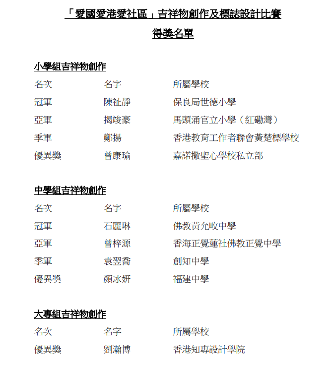 由「憲法和基本法推廣督導(dǎo)委員會(huì)」轄下「愛國(guó)主義教育工作小組」(工作小組)主辦的「愛國(guó)愛港愛社區(qū)」吉祥物創(chuàng)作及標(biāo)誌設(shè)計(jì)比賽已經(jīng)結(jié)束,並於今日(23日)公布比賽結(jié)果。