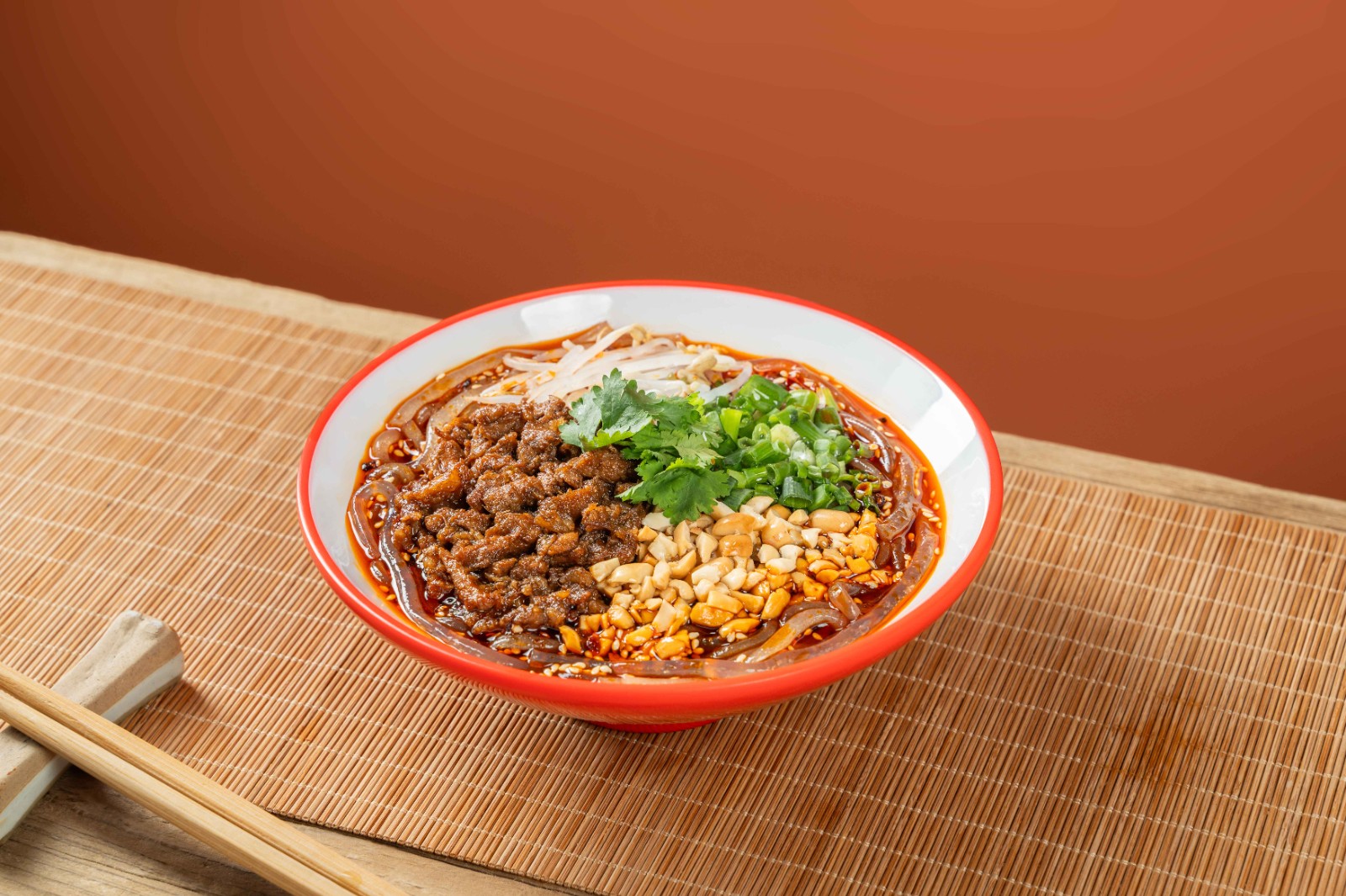 擔擔麵是重慶特產(chǎn)小吃,得名於挑擔叫賣的傳統(tǒng)。 其麵條細滑,主要以九園油辣子、花椒麵、芽菜、 芝麻醬等為佐料,鹹鮮過癮,醬香濃厚。