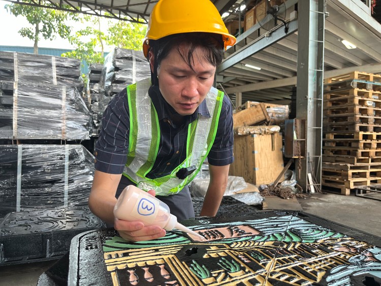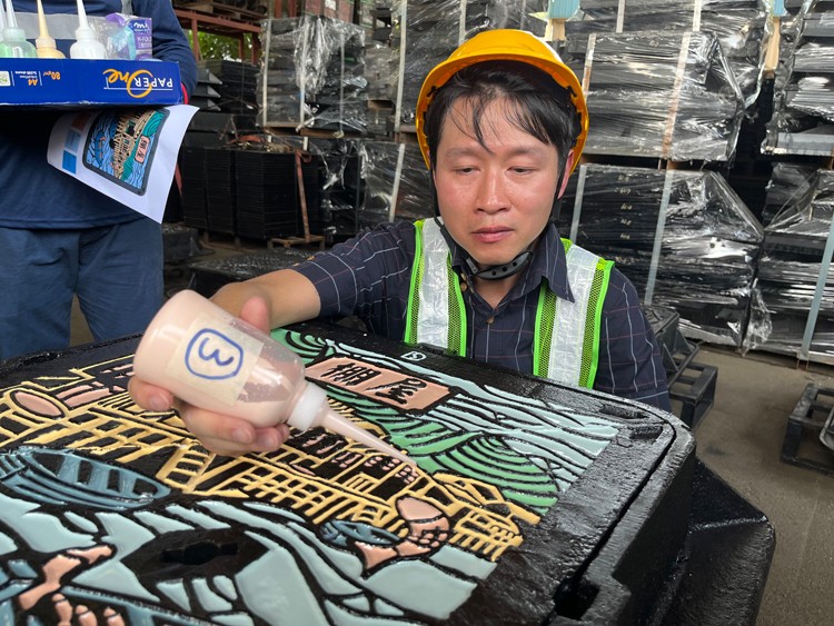 頂圖圖説:渠蓋鑄造廠負(fù)責(zé)人劉偉文示範(fàn)為渠蓋上色。