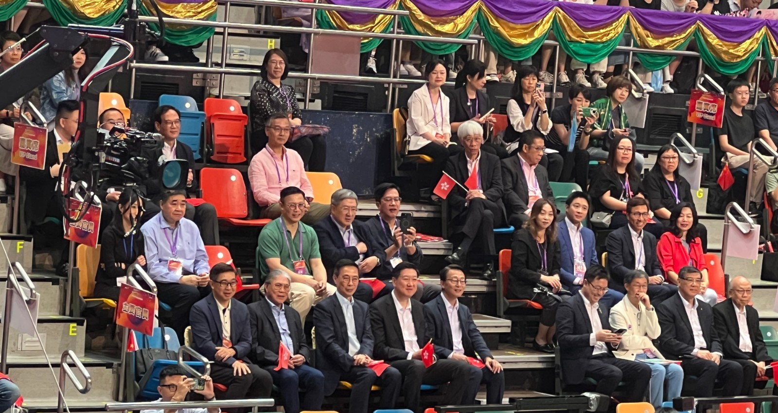 羽毛球項(xiàng)目,混雙冠軍鄭思維、黃雅瓊,對(duì)女雙冠軍陳清晨、賈一凡,彼此示範(fàn)打「高波」。陳清晨及賈一凡又與港隊(duì)女雙組合楊雅婷及楊霈霖,交換拍檔,切磋球技?;祀p運(yùn)動(dòng)員鄭思維、黃雅瓊與本港青年運(yùn)動(dòng)員交流,鄭思維展示招牌扣殺,引起全場(chǎng)觀眾歡呼及掌聲。