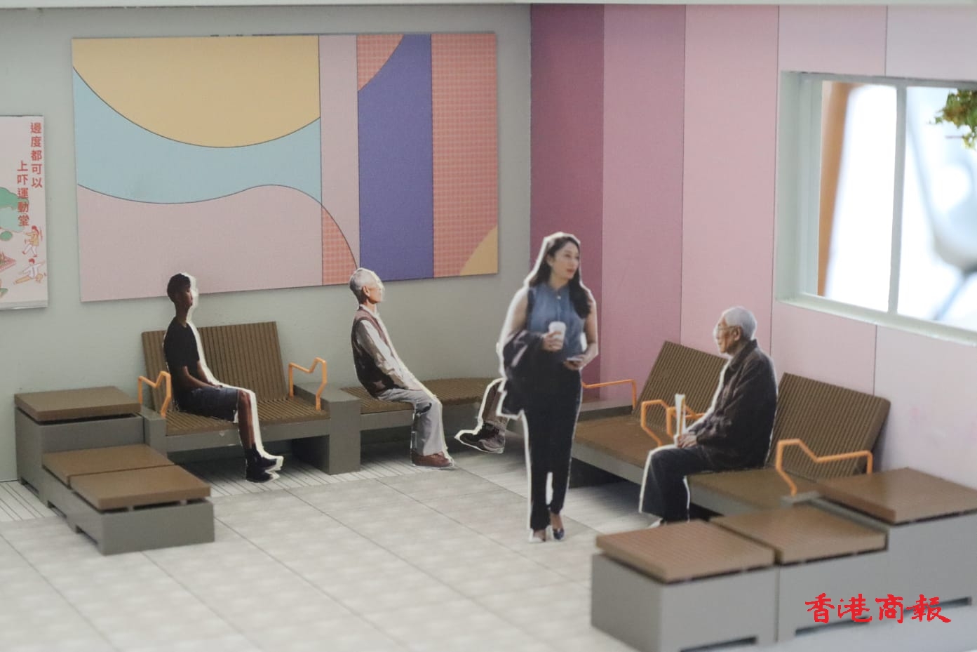 何永賢續(xù)介紹一些應(yīng)用「幸福設(shè)計(jì)」指引地方。第一是幸福小聚,是屋邨大堂,內(nèi)有適合長(zhǎng)者、小童不同高度的座椅,座椅設(shè)計(jì)可因應(yīng)當(dāng)時(shí)場(chǎng)景有不同組合,得出不同效果。香港理工大學(xué)設(shè)計(jì)學(xué)院與康復(fù)治療科學(xué)系聯(lián)同設(shè)計(jì)師智慧製作一組社交坐椅,可因應(yīng)不同環(huán)境、形狀來組合,會(huì)成為房署日後的標(biāo)準(zhǔn)設(shè)計(jì),方便人員配合不同屋邨的需要。大堂內(nèi)還會(huì)安裝掛鈎,方便居民提取信件時(shí)暫時(shí)掛上重物,而電梯內(nèi)設(shè)置倚靠長(zhǎng)椅,讓長(zhǎng)者可歇一歇。第二是流動(dòng)服務(wù)區(qū),讓流動(dòng)服務(wù)車如中醫(yī)車、流動(dòng)圖書館??浚瑫r(shí)附近有一些健康設(shè)施,可邊做運(yùn)動(dòng)邊輪侯,不會(huì)太沉悶。