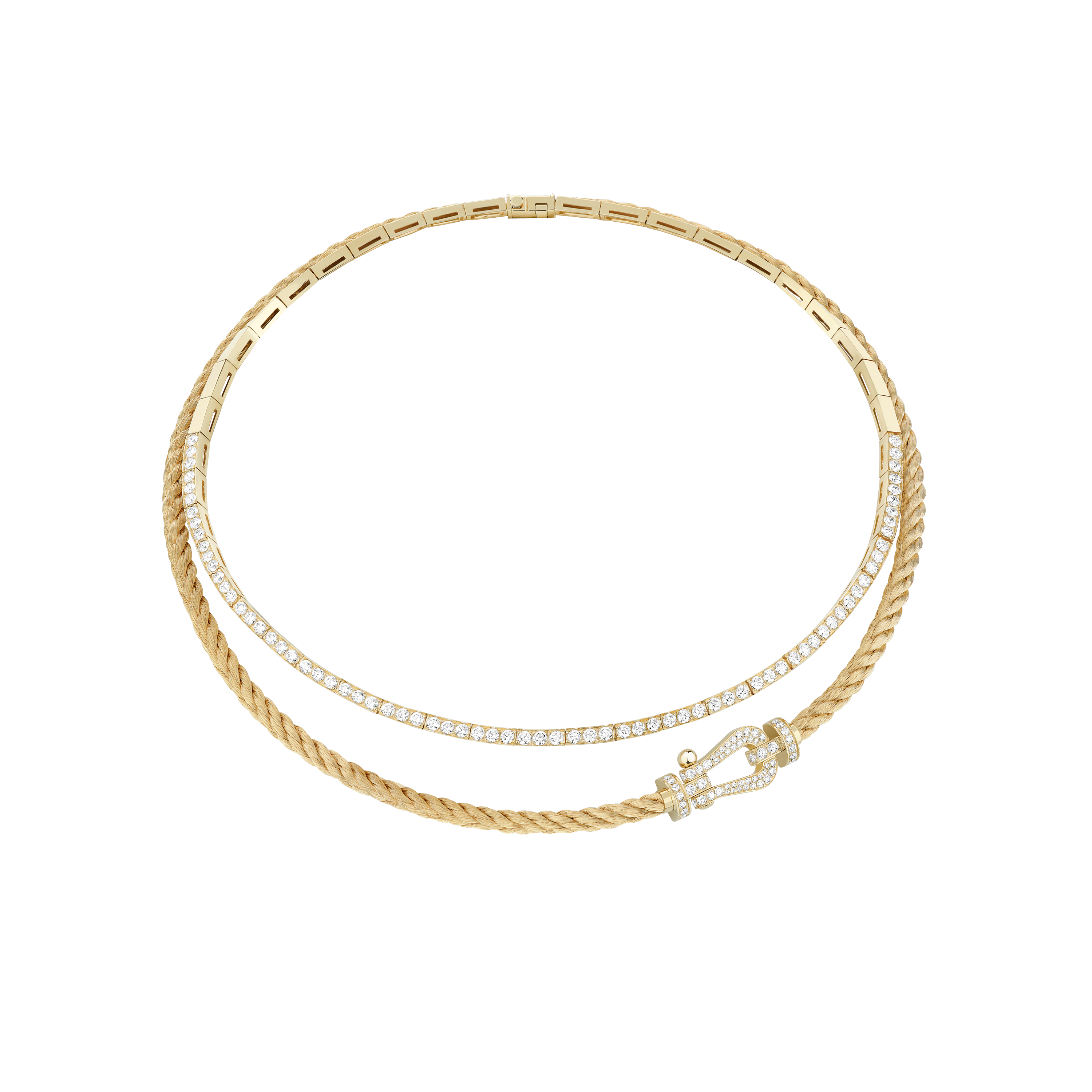 此次推出的短項鏈將鏈扣與三排黃金及鑽石鏈相結(jié)合,三種不同風(fēng)格的金屬鏈節(jié)透過流暢的線條設(shè)計,貼合身體的形態(tài)。另一款項鏈運(yùn)用了雙扭繩設(shè)計,展現(xiàn)多樣的風(fēng)格與佩戴方式,適合不同場合。第一款項鏈採用黃金或白金材質(zhì),搭配 Force 10 系列標(biāo)誌性的鏈繩與密鑲鑽石鏈扣,呈現(xiàn)出優(yōu)雅且適合日常佩戴的設(shè)計。第二款項鏈結(jié)合一排長方形黃金鏈條與半排密鑲鑽石,進(jìn)一步演繹材質(zhì)混搭的特點(diǎn)。