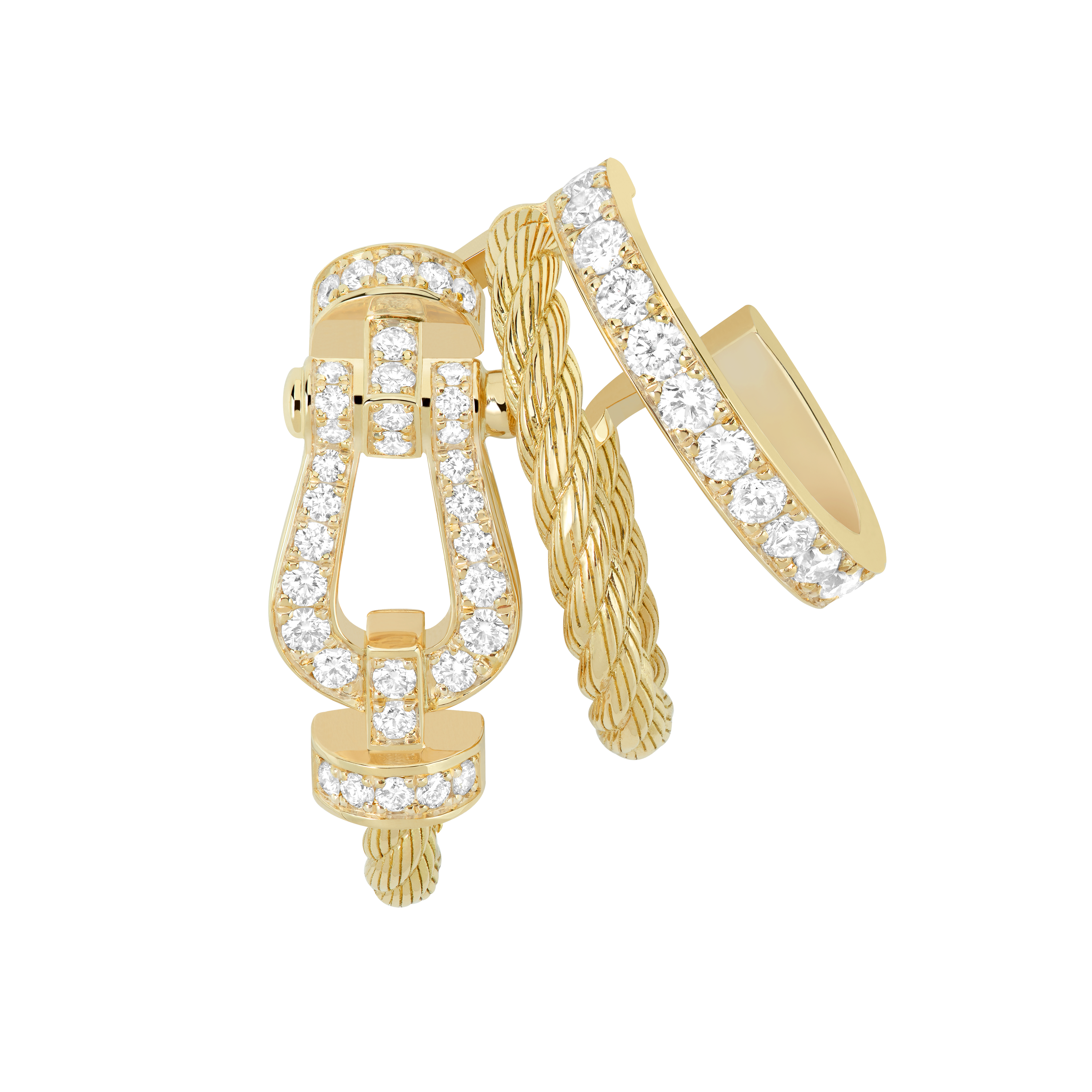 雙扭繩短項鏈的兩款配套耳環(huán)設(shè)計也獨(dú)具匠心。耳環(huán)的設(shè)計由三個環(huán)圈構(gòu)成,將項鏈的三個關(guān)鍵元素——密鑲鑽石鏈扣、長方形黃金鏈條和鑽石鏈條逐一呈現(xiàn)在耳環(huán)上。單隻夾式耳環(huán)可自由佩戴在耳朵的不同位置,穿搭者可以根據(jù)心情或造型來調(diào)整,展現(xiàn)百變形像。