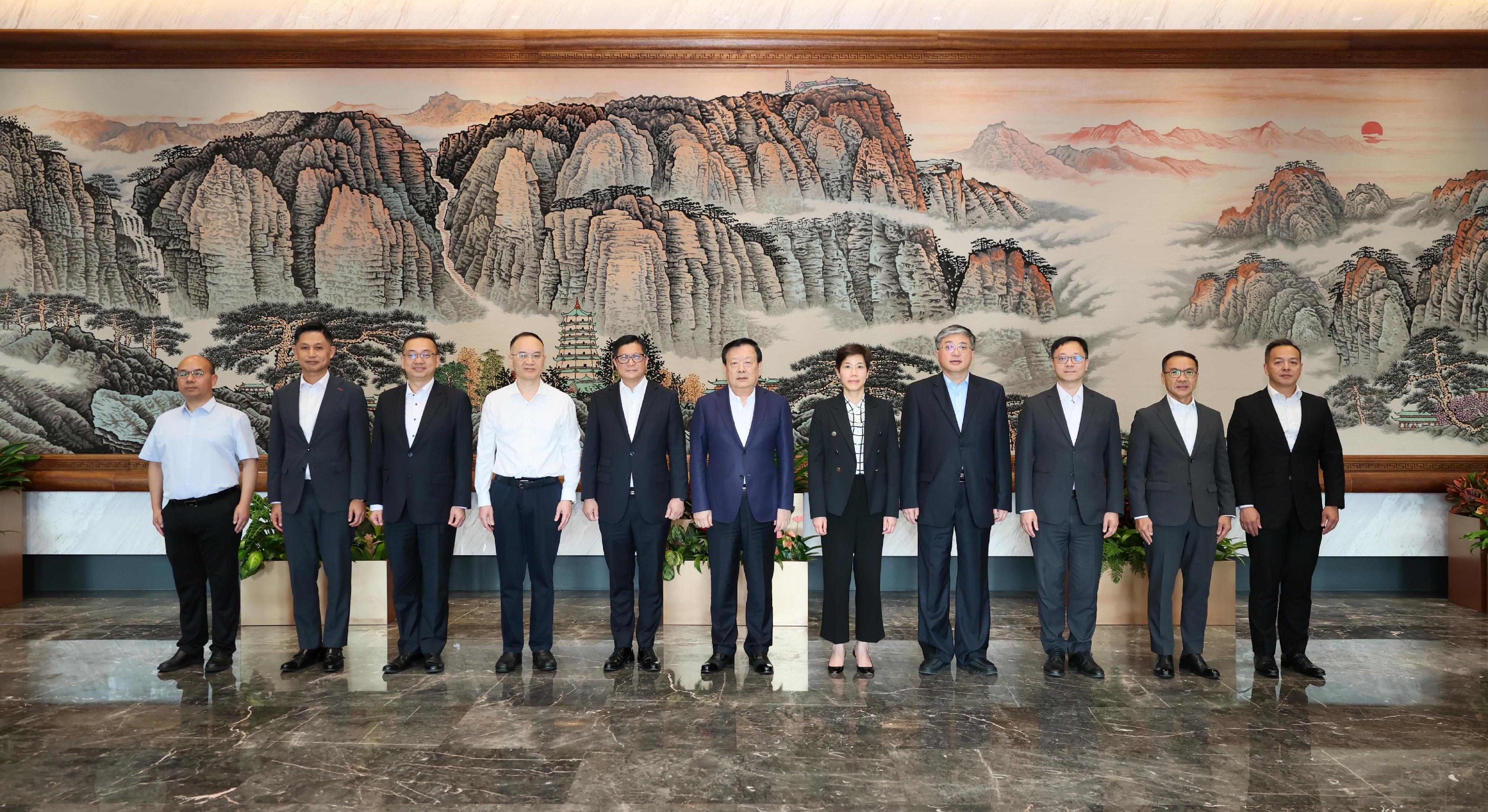 鄧炳強(qiáng)(左五)與中央港澳工作辦公室主任、國務(wù)院港澳事務(wù)辦公室主任夏寶龍(中)、國務(wù)院港澳事務(wù)辦公室副主任農(nóng)融(左四)、中央人民政府駐香港特別行政區(qū)聯(lián)絡(luò)辦公室副主任羅永綱(右四)及交流團(tuán)成員合照。