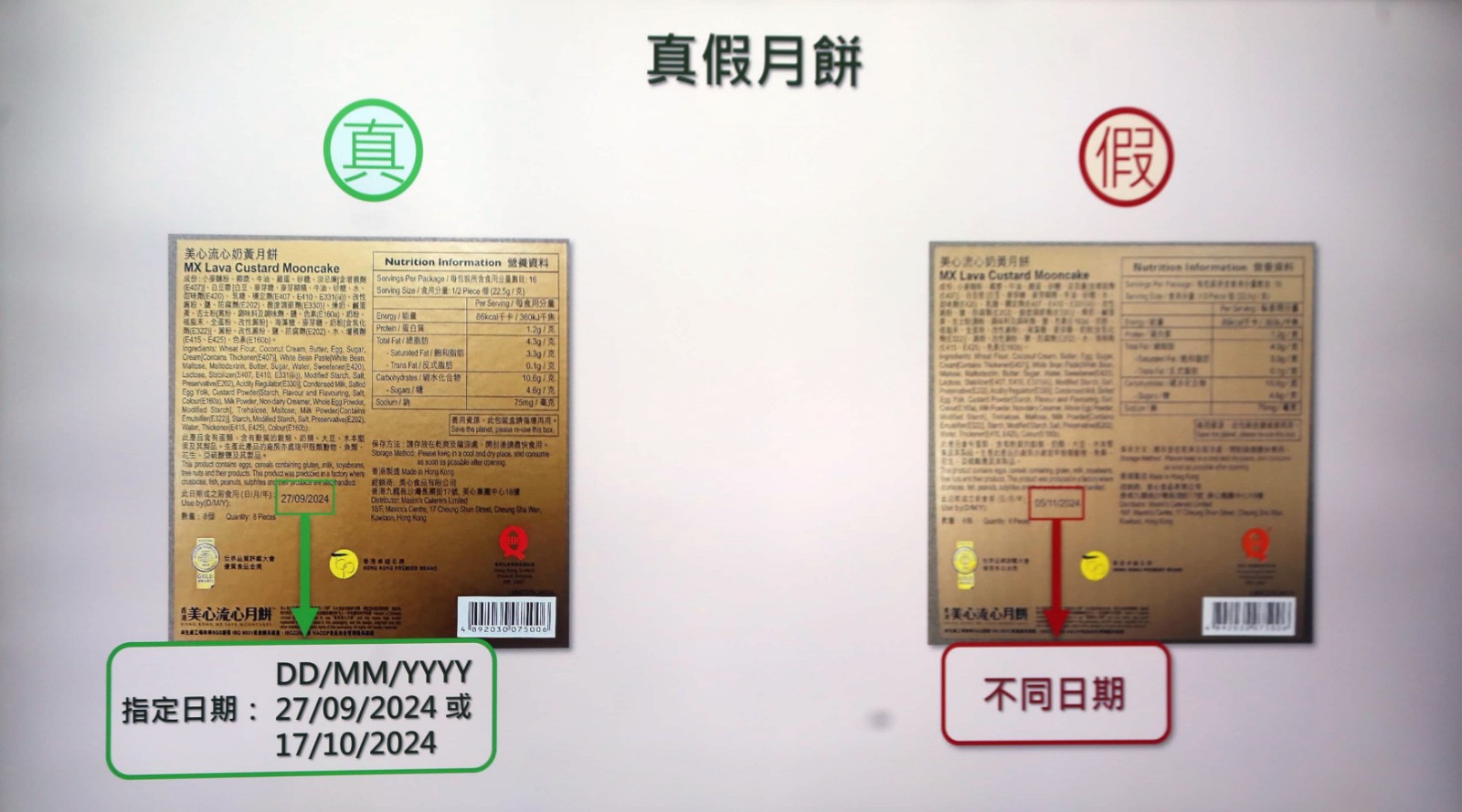 廖聞晉說(shuō),檢獲的冒牌月餅涉及多個(gè)品牌,其中一個(gè)品牌主要售賣皮具和時(shí)裝,根據(jù)商標(biāo)持有人資料,並沒(méi)有設(shè)計(jì)和生產(chǎn)月餅及餐具,該品牌的冒牌月餅網(wǎng)上售價(jià)600至800元。另一個(gè)品牌的冒牌月餅抄襲正貨包裝盒的外觀設(shè)計(jì)和註冊(cè)商標(biāo),正貨印有「Magical」字樣,冒牌側(cè)串法錯(cuò)誤,將「Magical」中的「c」寫錯(cuò)作「e」。正貨包裝盒側(cè)面凹凸文細(xì)緻,冒牌則有明顯分別;正貨日期食用日期是2024年9月27日或2024年10月17日或之前,冒牌最佳食用日期則有不同日子。