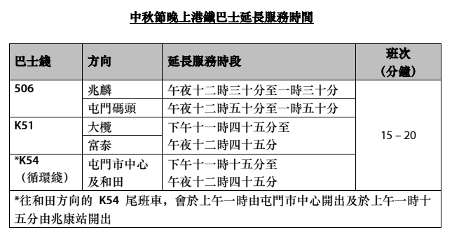 另外,港鐵會(huì)於9月17日中秋節(jié)加強(qiáng)列車服務(wù),方便大家外出慶祝,8條本地鐵路線由當(dāng)日下午3時(shí)起加強(qiáng)服務(wù),不包括機(jī)場(chǎng)快線及迪士尼線;所有本地鐵路線及7條輕鐵路線通宵行駛,不包括機(jī)場(chǎng)快線、迪士尼線及東鐵線往返羅湖及落馬洲站;港鐵巴士506、K51及K54延長(zhǎng)服務(wù)。