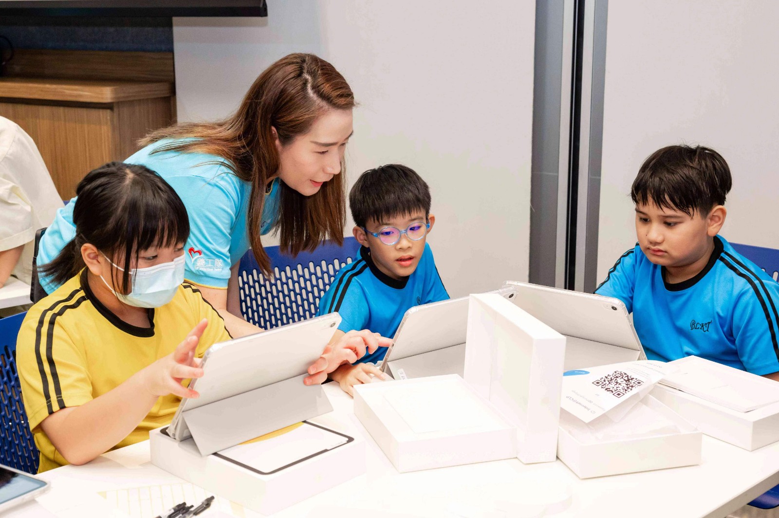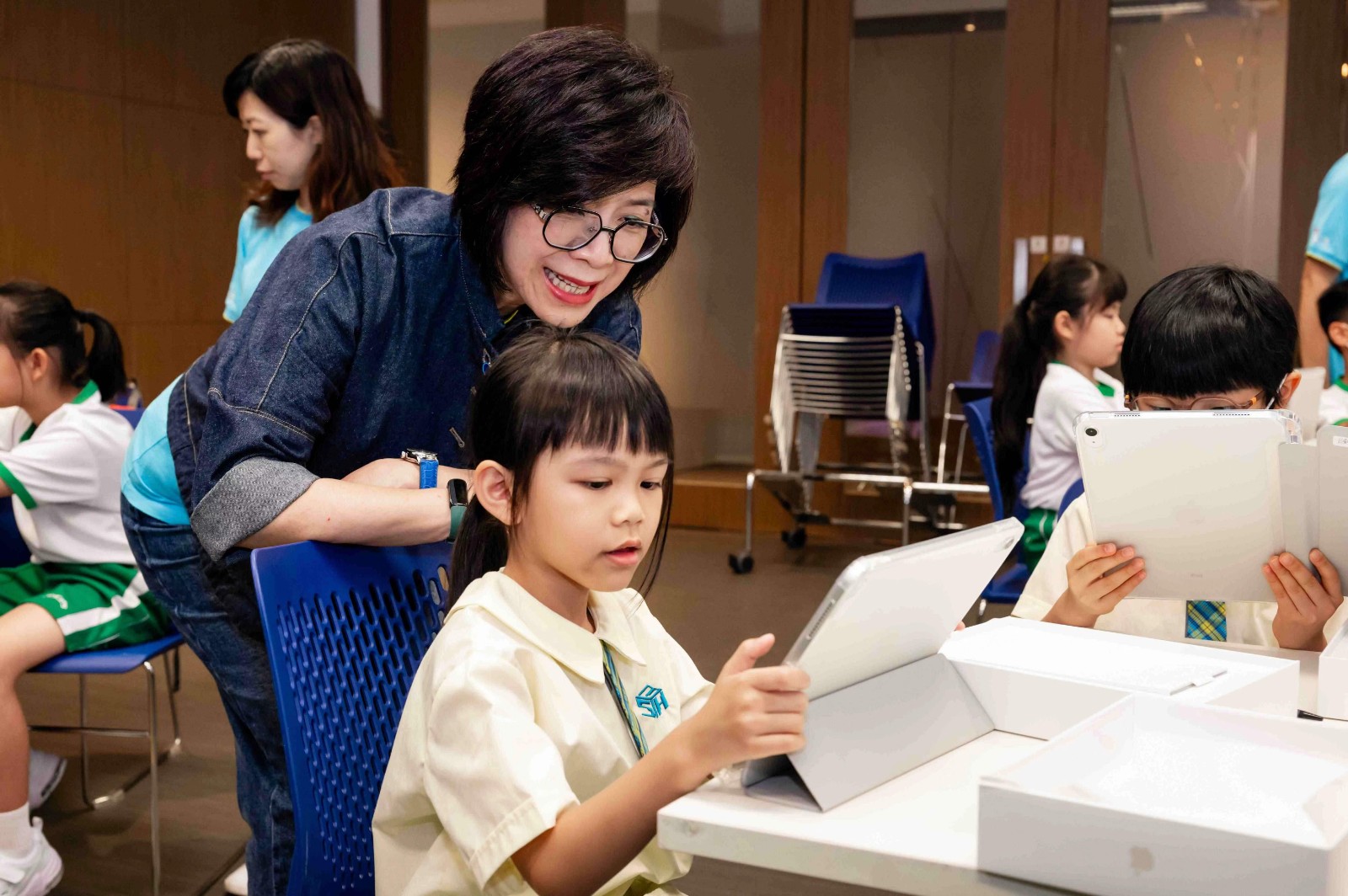 中電企業(yè)發(fā)展總裁莊偉茵及中電義工協(xié)助受惠學(xué)生熟習(xí)平板電腦的操作,鼓勵(lì)學(xué)生善用電子學(xué)習(xí)器材去發(fā)掘不同的知識。