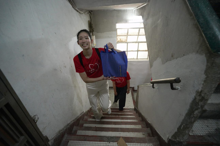 包括江旻憓在內(nèi)的一眾馬會義工,步行上唐樓探訪,感受長者出入的困難。