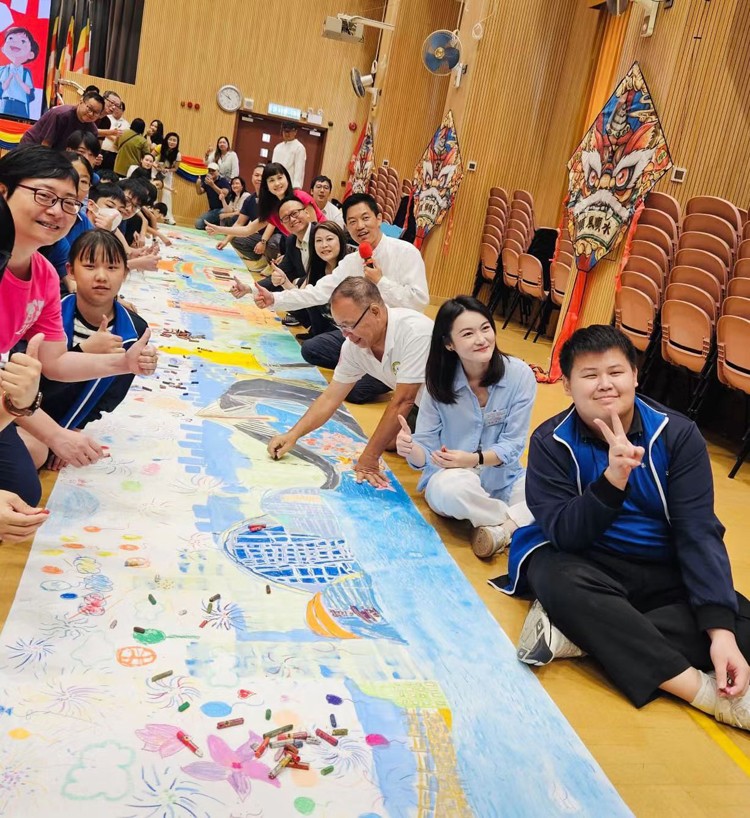勵心服務協(xié)會會長歐麗瓊、深圳市風箏協(xié)會會長于灝、西貢區(qū)各界聯(lián)合會主席莊元苳、西貢民政事務處聯(lián)絡主任計慧盈、香海正覺蓮社佛教正覺中學校長徐菀楠、西貢區(qū)議員施彬彬、溫啟明、祁麗媚、周家樂、西貢區(qū)家長教師會聯(lián)會主席何秀芳、香港競技風箏協(xié)會會長賴華景以及正覺中學的學生、家長和老師等接近100人共同參與是次活動,一起創(chuàng)作一幅將與深圳及澳門青少年創(chuàng)作部分拼接組成的名為《灣區(qū)同心築夢向未來》的75米繪畫長卷,通過描繪大灣區(qū)美景,粵港澳三地城市地標,激發(fā)青少年感恩祖國,奮發(fā)向上的濃厚情感。另外,參加者亦合力製作了一條以祝福新中國成立75周年華誕為主題的龍形簽名風箏,共同祝願偉大祖國繁榮昌盛,國泰民安。