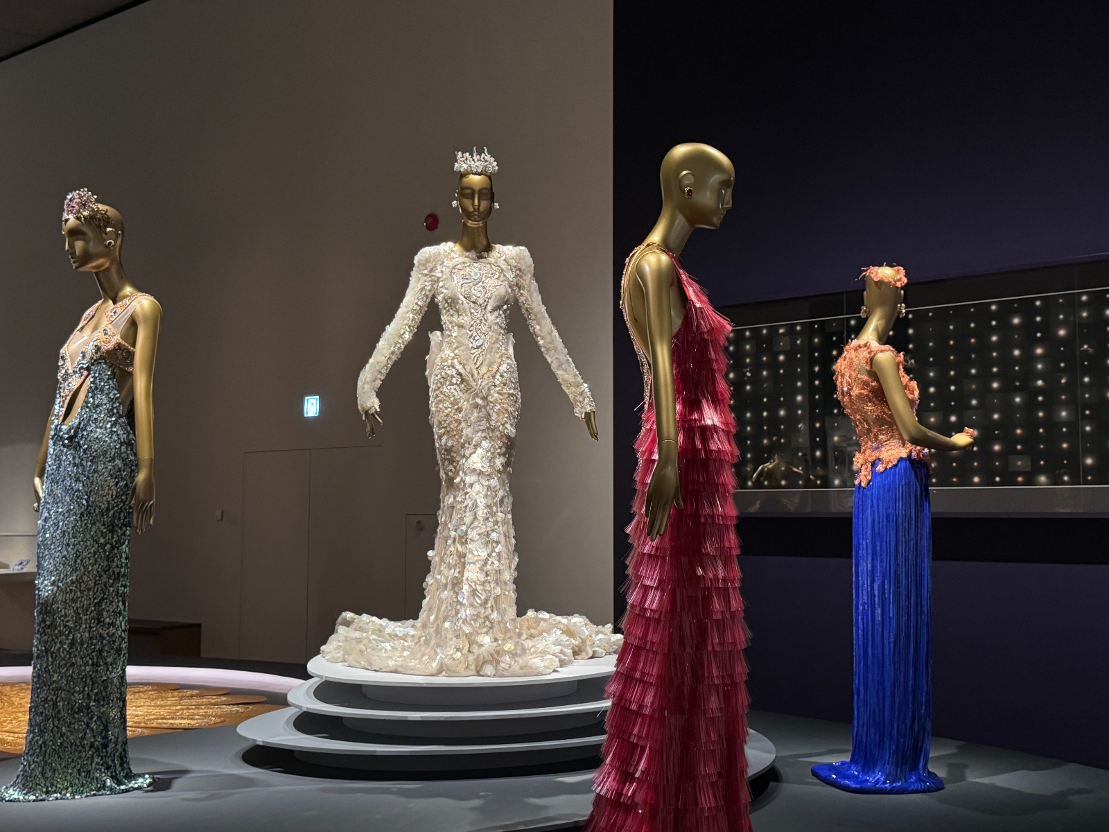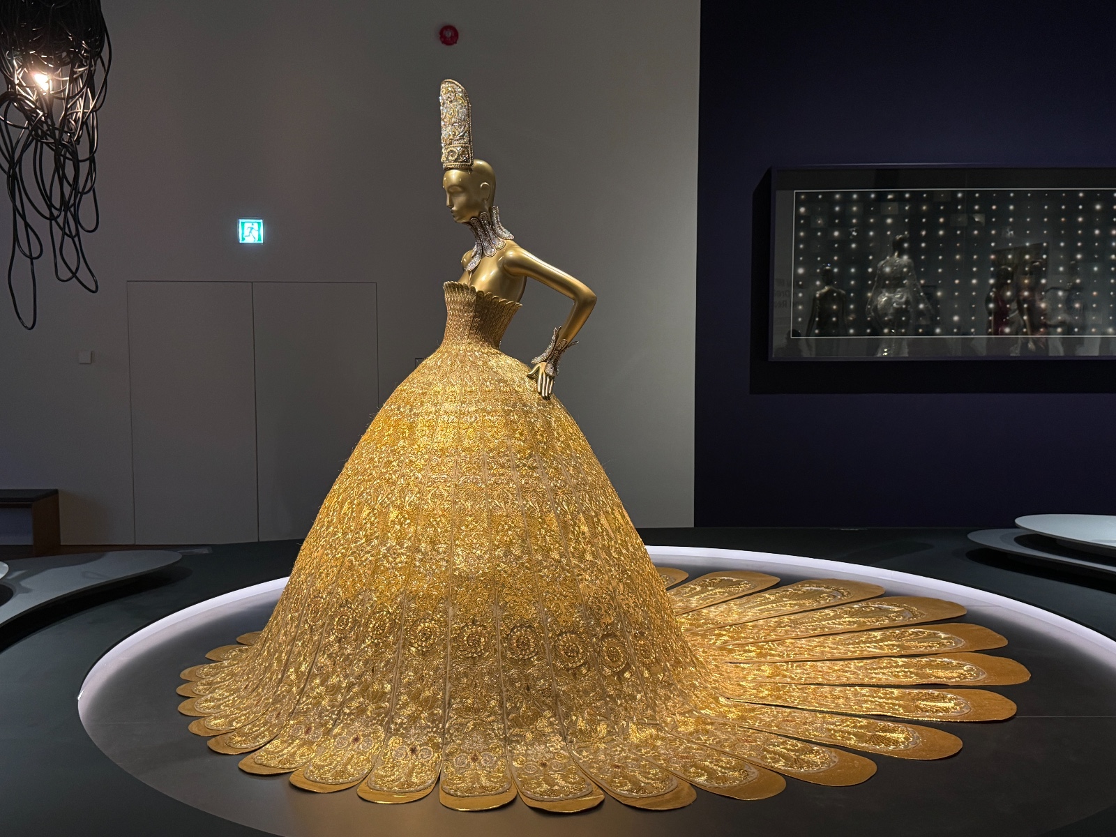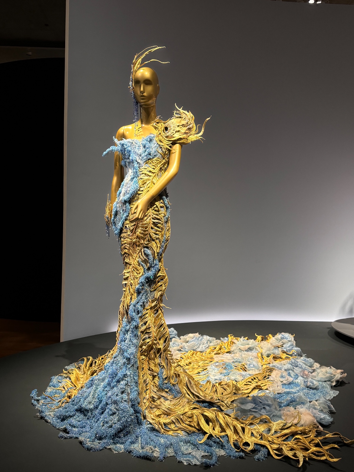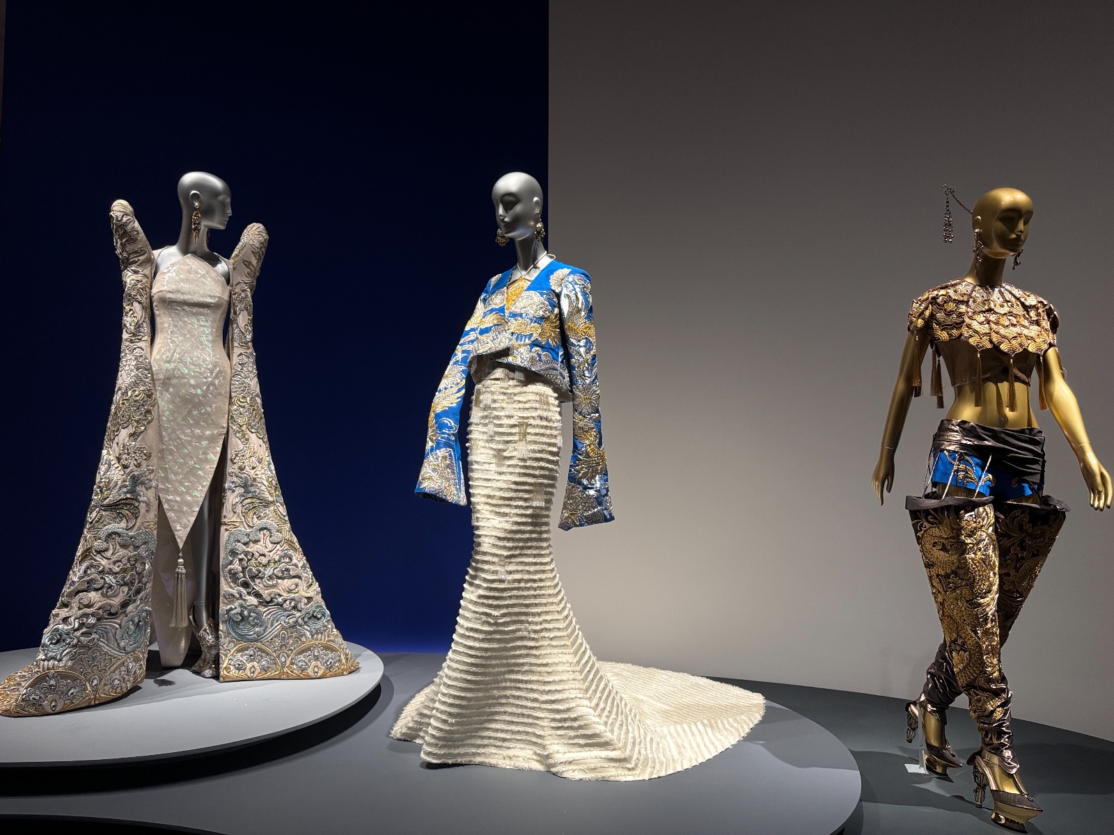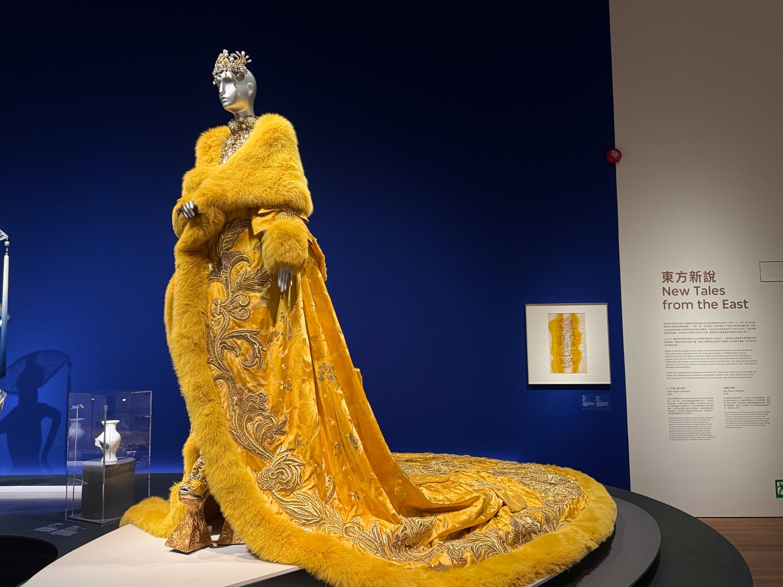 「東方新說」展區(qū)呈現(xiàn)了《一千零二夜》(2009)和《東宮》(2019)系列。談到郭培,很多人都會聯(lián)想到她那件讓全球矚目的《黃皇后》(一千零二夜系列)禮服。這件作品曾由美國歌手Rihanna在2015年Met Gala慈善晚宴上穿著,點燃了全世界的關(guān)注。重達(dá)25公斤,袍長四米的《黃皇后》不僅僅是一件時裝,更展示了女性的自信與力量?!兑磺Я愣埂废盗徐`感源自經(jīng)典的《一千零一夜》故事集,這個系列充滿了中東與亞洲文化的交融。郭培通過複雜的刺繡、珠飾和奢華的面料,展現(xiàn)了神秘而迷人的東方世界。每一件禮服都像是從古老的故事中走出來的,帶著濃郁的異域風(fēng)情,講述了關(guān)於勇氣、智慧與愛情的故事,將古老的東方神話與現(xiàn)代時尚結(jié)合。作品中充滿了奇幻色彩,充實了視覺上的戲劇性,令觀眾恍如置身於那個充滿傳奇的故事世界。