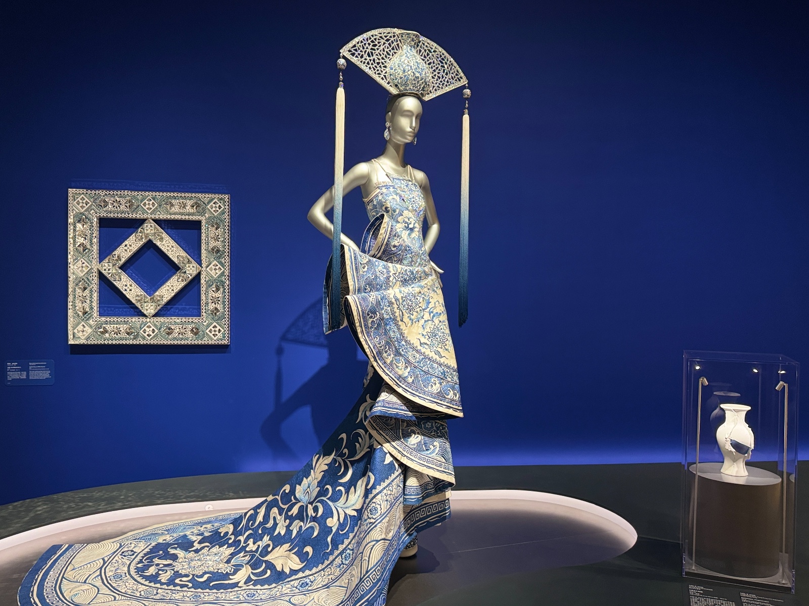 《青花瓷》出自《一千零二夜》系列,這件作品的靈感來自中國傳統(tǒng)青花瓷禮服上的祥雲(yún)紋、水紋和蓮花紋等圖案,均以手繪面料結(jié)合手工刺繡展現(xiàn)出來。裙身的多層褶邊,營造出雕塑般的立體感,遠(yuǎn)看似由青花瓷片組成。頭飾則形似一把傳統(tǒng)中式摺扇,扇面正中為花瓶結(jié)構(gòu),耗時近一萬小時製作完成。