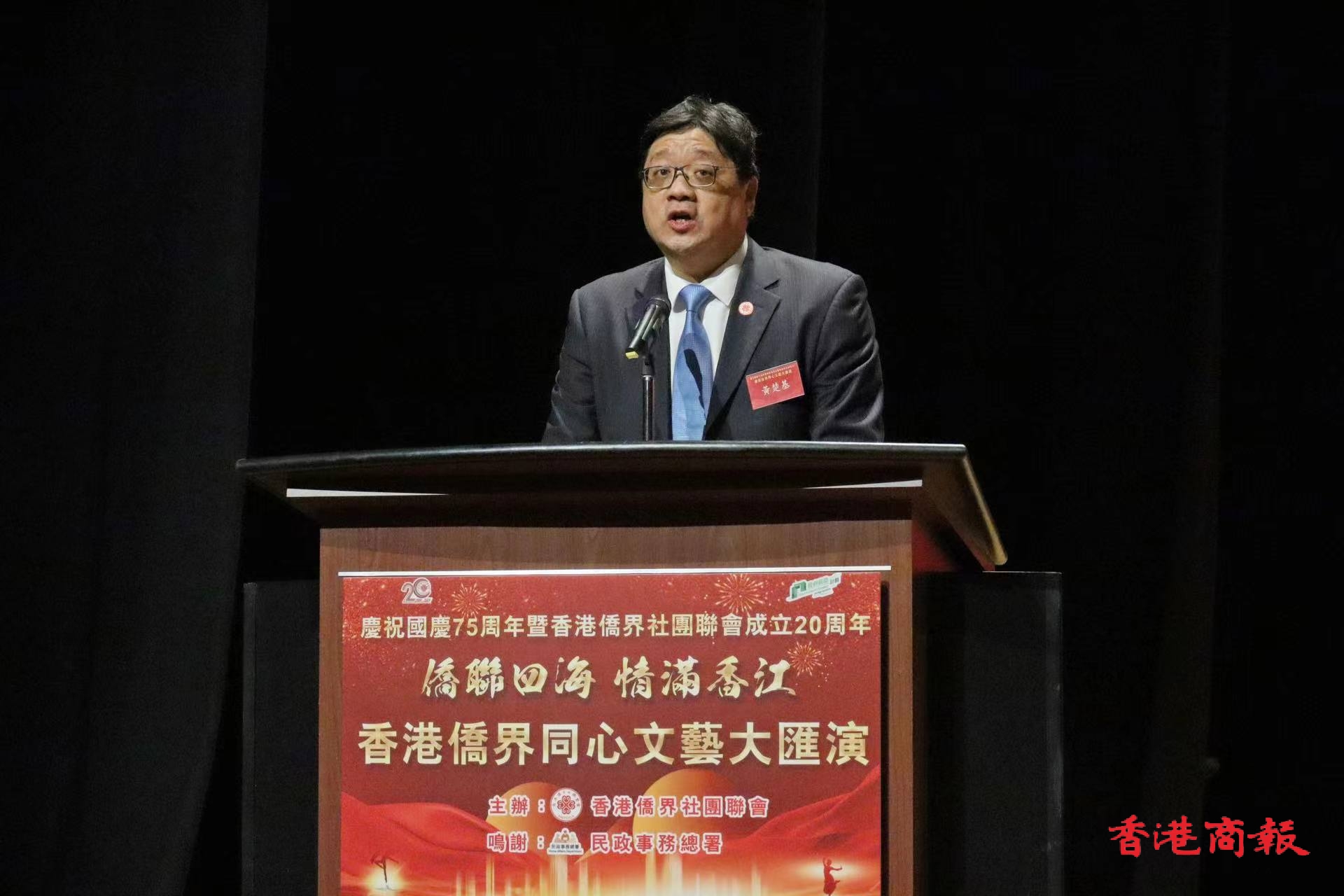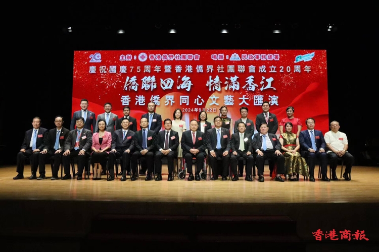 由香港僑界社團(tuán)聯(lián)會(huì)主辦的「僑聯(lián)四海 情滿香江」香港僑界同心文藝大匯演今日於香港理工大學(xué)賽馬會(huì)綜藝館舉行,歡聚慶祝國(guó)慶75周年暨香港僑界社團(tuán)聯(lián)會(huì)成立20周年。中聯(lián)辦協(xié)調(diào)部副部長(zhǎng)陳澤濤,中國(guó)僑聯(lián)副主席、香港僑界社團(tuán)聯(lián)會(huì)首席主席余國(guó)春,全國(guó)政協(xié)常委、澳門歸僑總會(huì)會(huì)長(zhǎng)劉雅煌,全國(guó)政協(xié)委員、中國(guó)僑聯(lián)常委、香港僑界社團(tuán)聯(lián)會(huì)會(huì)長(zhǎng)黃楚基等出席主禮。