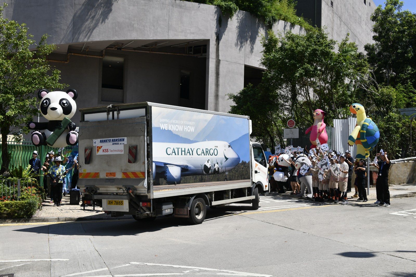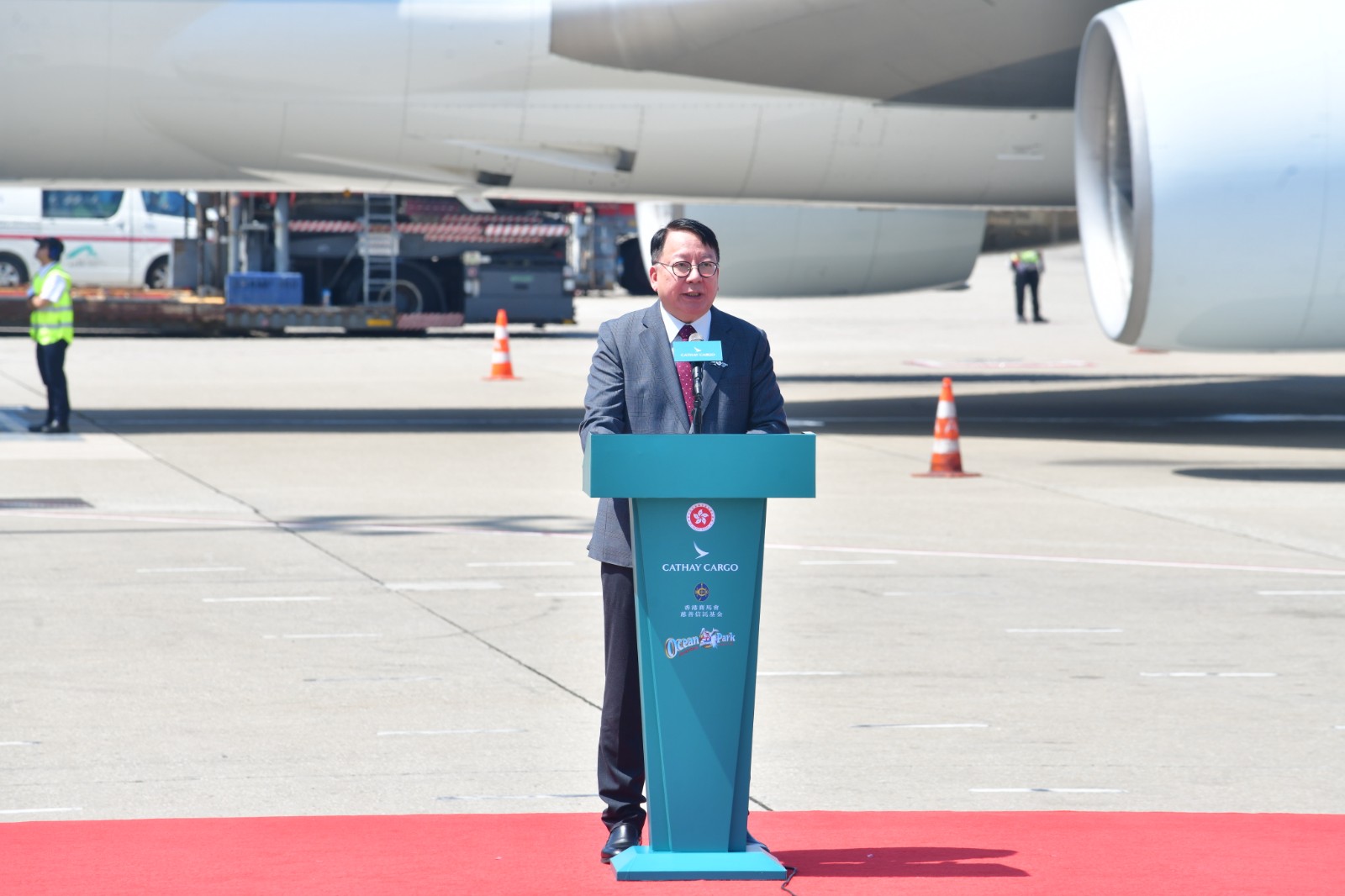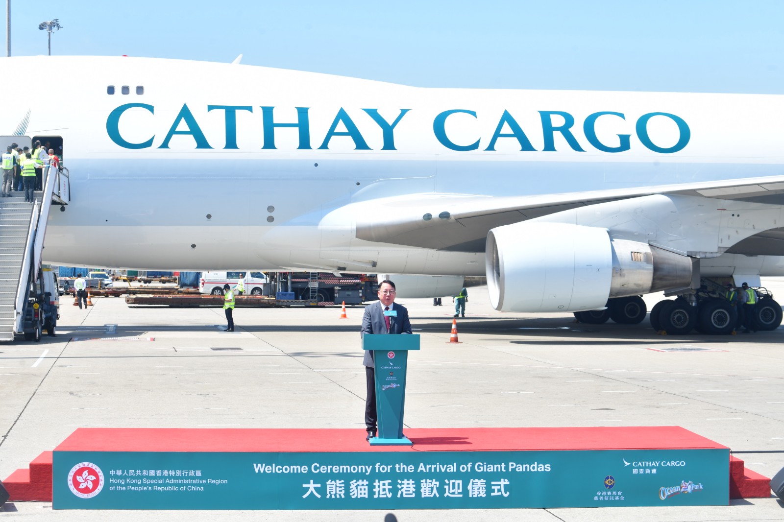 中央早前贈港的一對大熊貓「安安」和「可可」今日(26日)上午11時許乘坐國泰航空貨機(jī),順利抵達(dá)香港國際機(jī)場,特區(qū)政府在機(jī)場舉行大熊貓抵港歡迎儀式,政務(wù)司司長陳國基、文化體育及旅遊局局長楊潤雄出席。陳國基致辭時代表特區(qū)政府感謝中央贈送一對大熊貓,指國慶75周年將至,在充滿喜悅的時刻,一對剛剛成年、充滿活力的大熊貓加入香港大家庭,是「喜上加喜」。