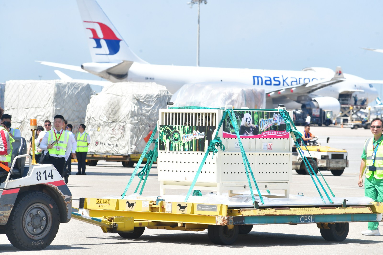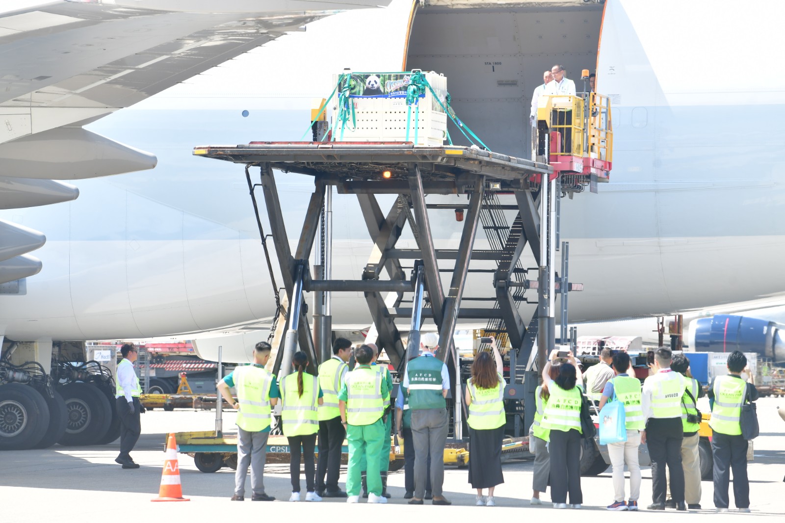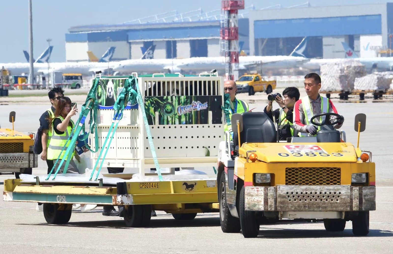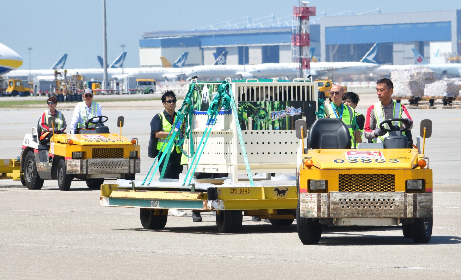 「安安」和「可可」抵達(dá)後,漁護(hù)署和海洋公園人員分別上機(jī)為牠們做初步健康檢查,運(yùn)輸籠透過升降臺運(yùn)至停機(jī)坪,「安安」和「可可」在籠內(nèi)探頭張望,其後坐專車被送往海洋公園。