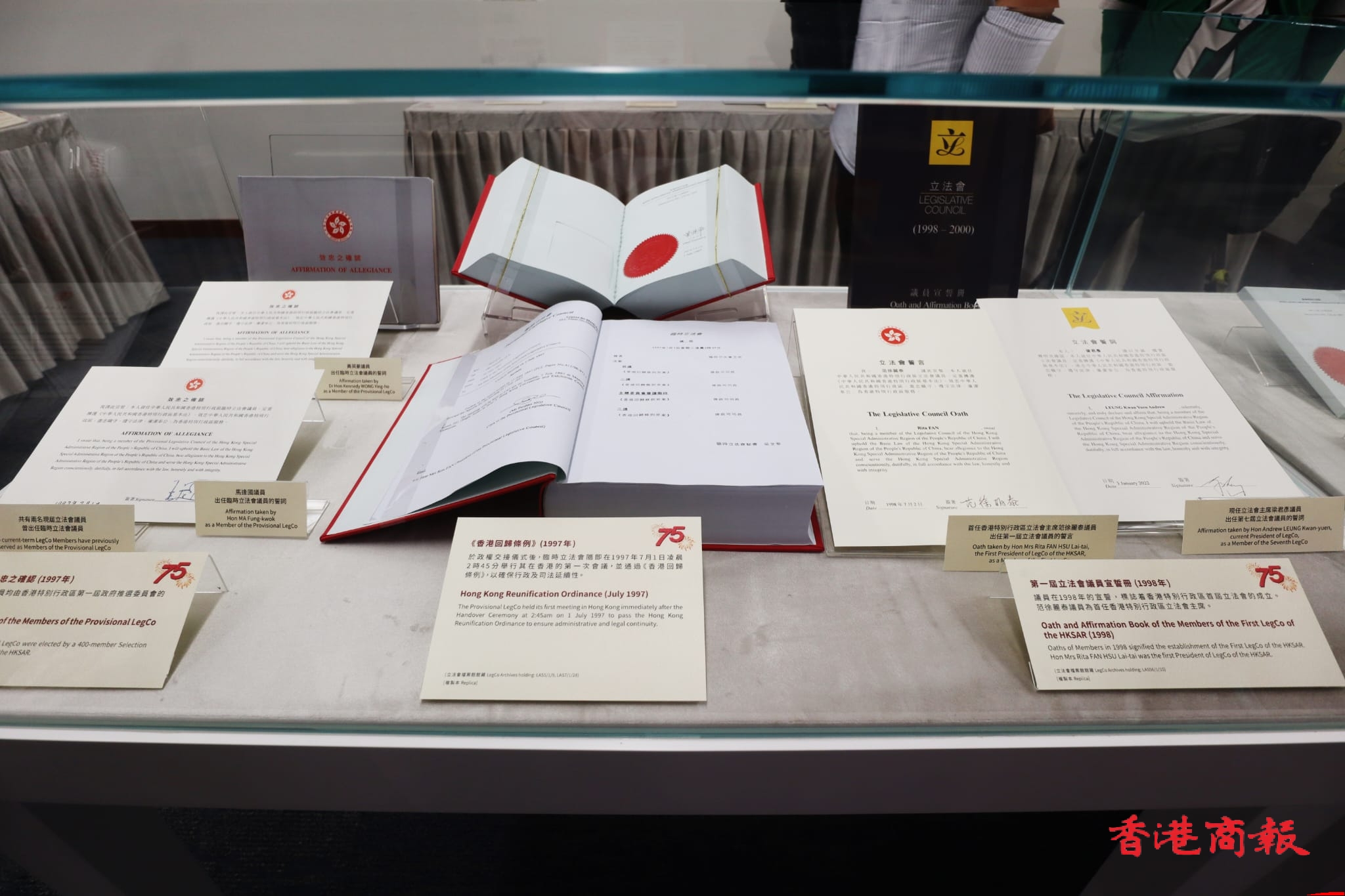 梁君彥介紹,《立法會(huì)?家國(guó)情》展覽的第一部分有七大主題展板,主題分為政制、民心相連、經(jīng)濟(jì)發(fā)展、基建、民生、創(chuàng)新科技和文化體育。第二部分是內(nèi)地不同部委向立法會(huì)捐贈(zèng)很多不同東西,如司法部與法院送贈(zèng)的禮物、前往上海世博參觀時(shí)送贈(zèng)的禮物、全國(guó)婦聯(lián)送贈(zèng)的禮物、清明上河圖刺繡、C919董事長(zhǎng)送贈(zèng)大的飛機(jī)模型、高鐵象徵香港與國(guó)家進(jìn)入高速聯(lián)繫。第三部分是立法會(huì)圖書(shū)館和檔案館的精選館藏,當(dāng)中有1997年立法會(huì)條例,進(jìn)出口界立法會(huì)議員黃英豪有份通過(guò)、另有第一屆立法會(huì)主席宣誓與第七屆立法會(huì)主席宣誓,觀眾可了解誓詞分別。