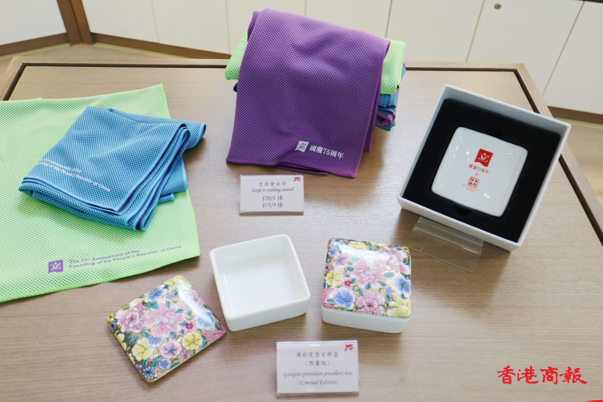此外,立法會(huì)特別製作了限量版紀(jì)念品,包括與本地瓷器廠合製、印有國(guó)慶75周年字樣的限量版港彩瓷器首飾盒,只供議員購(gòu)買,以及3款顏色冰巾。(圖片:馮瀚文攝)