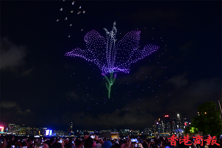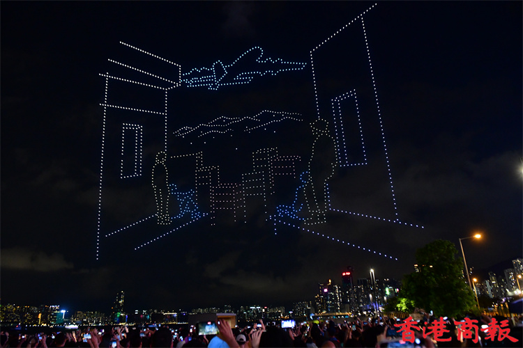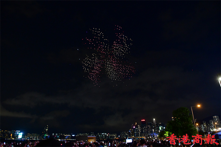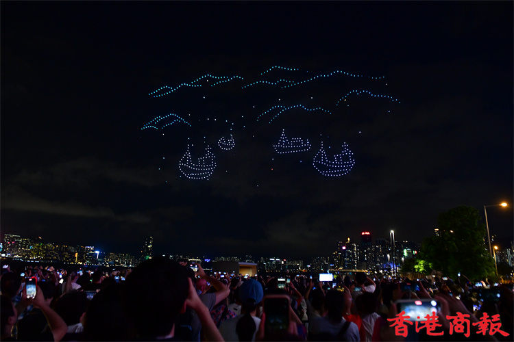 為慶祝國(guó)慶75周年,旅遊發(fā)展局今日晚上8時(shí)在灣仔海濱舉行長(zhǎng)約15分鐘的「香港馬騰盛世」無(wú)人機(jī)表演,吸引大批市民與遊客觀(guān)賞。
