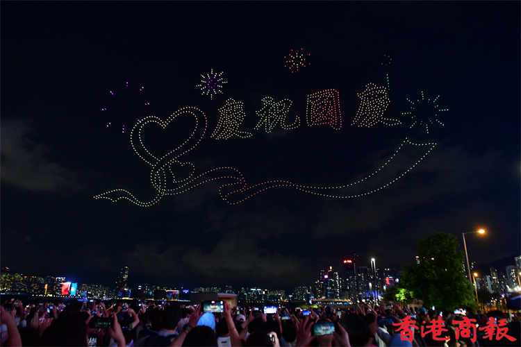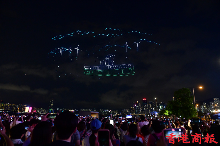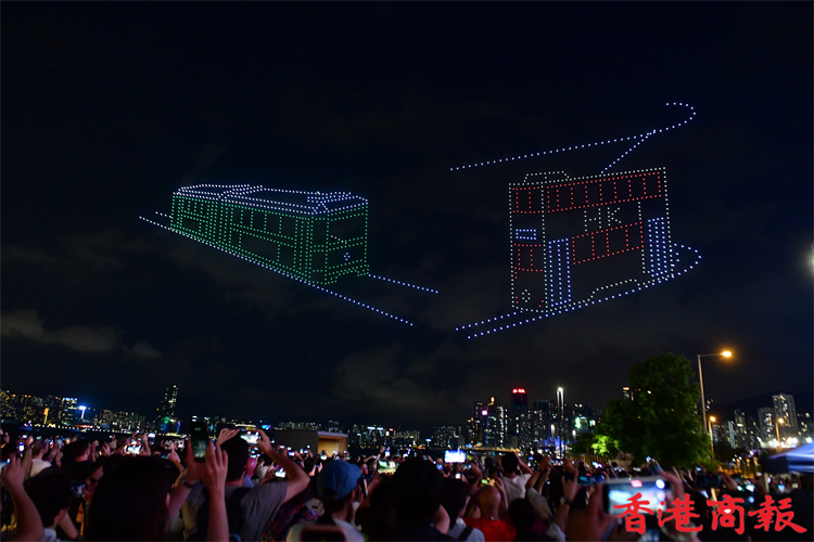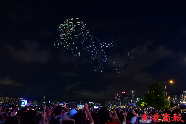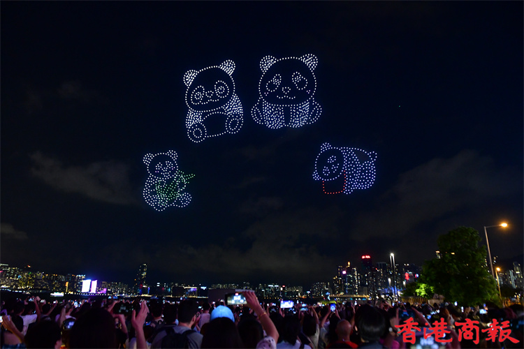 此外,今次表演亦細(xì)緻描繪香港從小漁村發(fā)展成國(guó)際大都會(huì)的華麗歷程,多幕香港今昔風(fēng)貌圖案包括漁村、港灣、九龍城寨、獅子山、天星小輪、電車(chē)等將活現(xiàn)眼前。在表演尾聲,無(wú)人機(jī)砌出4隻大熊貓圖案及慶祝國(guó)慶75周年的中英文字樣。(記者 崔俊良攝)