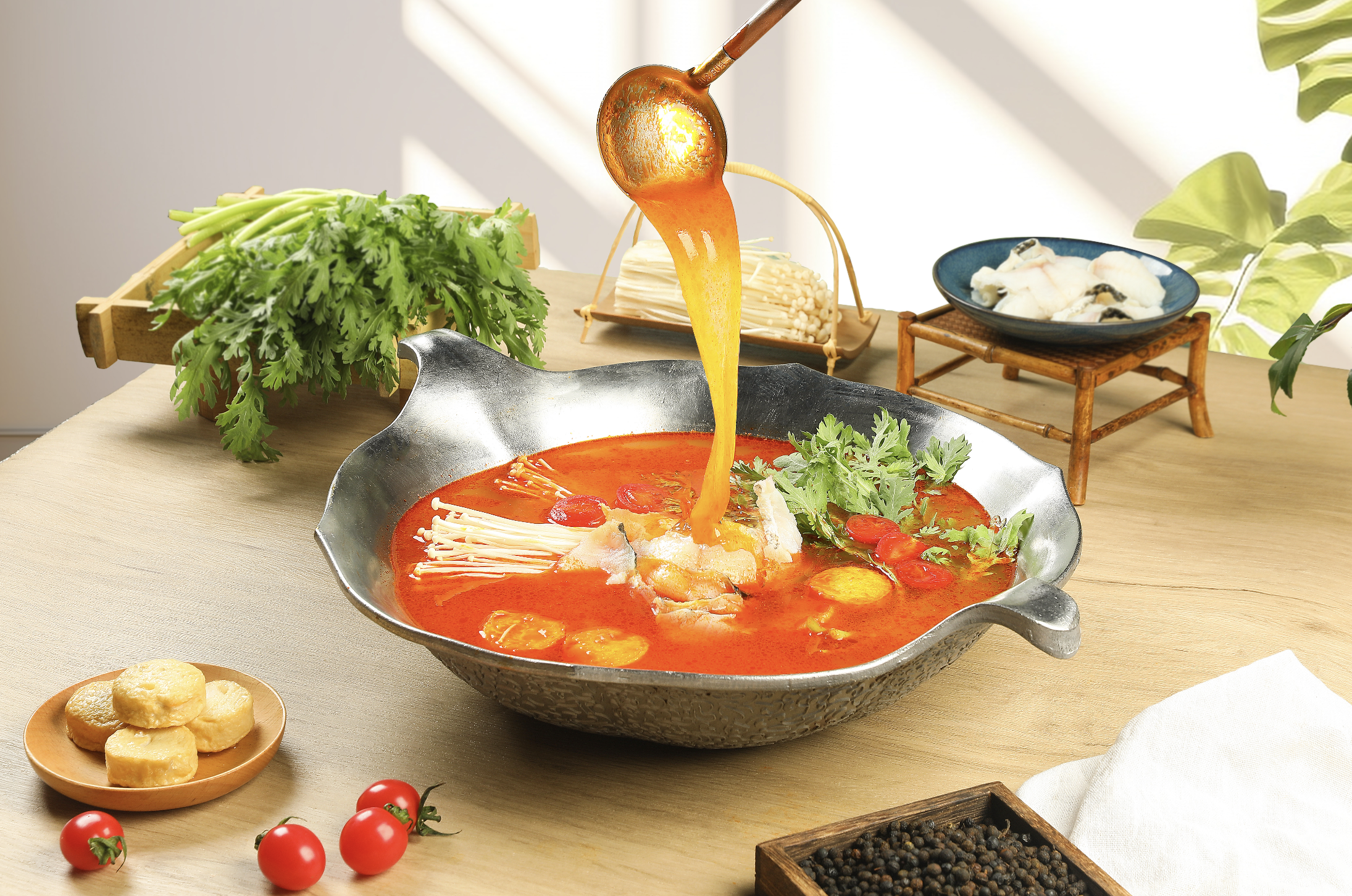 另一款新鍋底「貴州木姜子酸湯」則選用野生木薑子,結(jié)合經(jīng)過自然發(fā)酵的新鮮番茄,帶來獨特的酸湯風味。這款湯底香氣濃郁,酸甜交融,搭配牛骨熬製,適合涮牛肉、海鮮和蔬菜,能夠凸顯食材的本味,且耐久煮,風味持久。