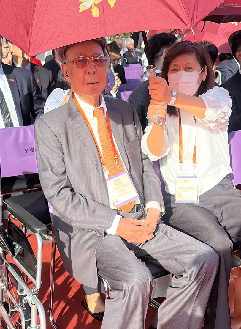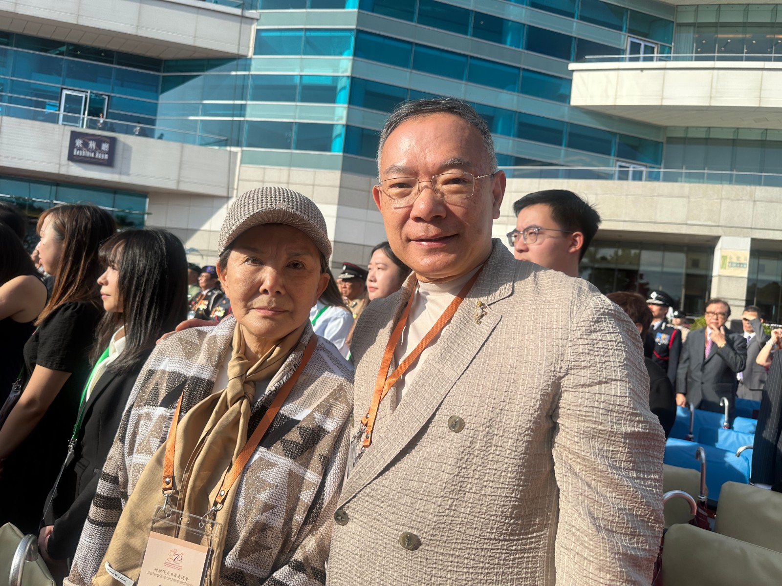 升旗儀式結(jié)束後,李家超與太太林麗嬋攜手走下臺階。記者 木子攝