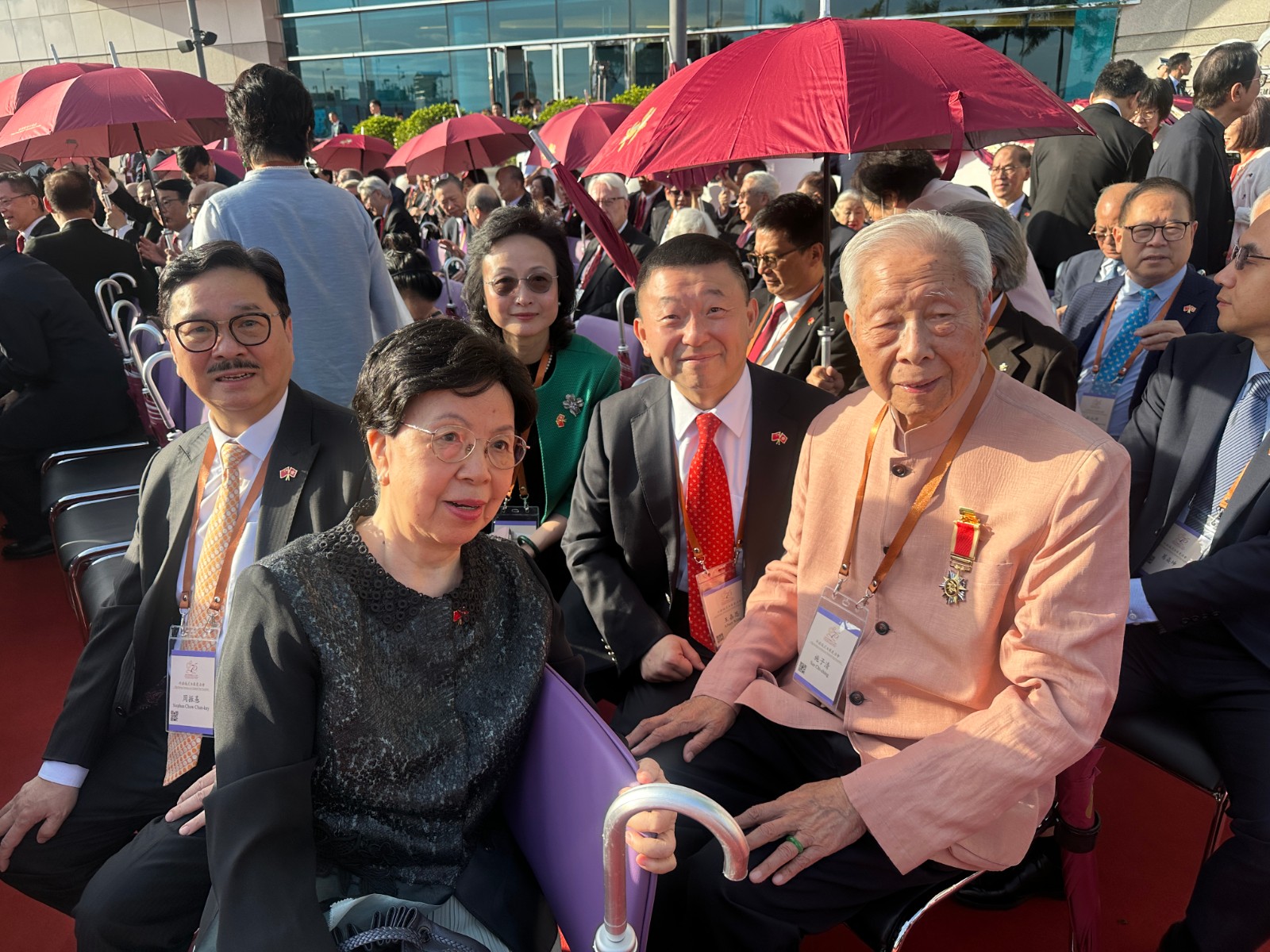 行政長官李家超、全國政協(xié)副主席梁振英、中聯(lián)辦主鄭雁雄、前行政長官林鄭月娥及曾蔭權(quán),立法會主席梁君彥、行政會議召集人葉劉淑儀等出席升旗儀式。記者 木子攝