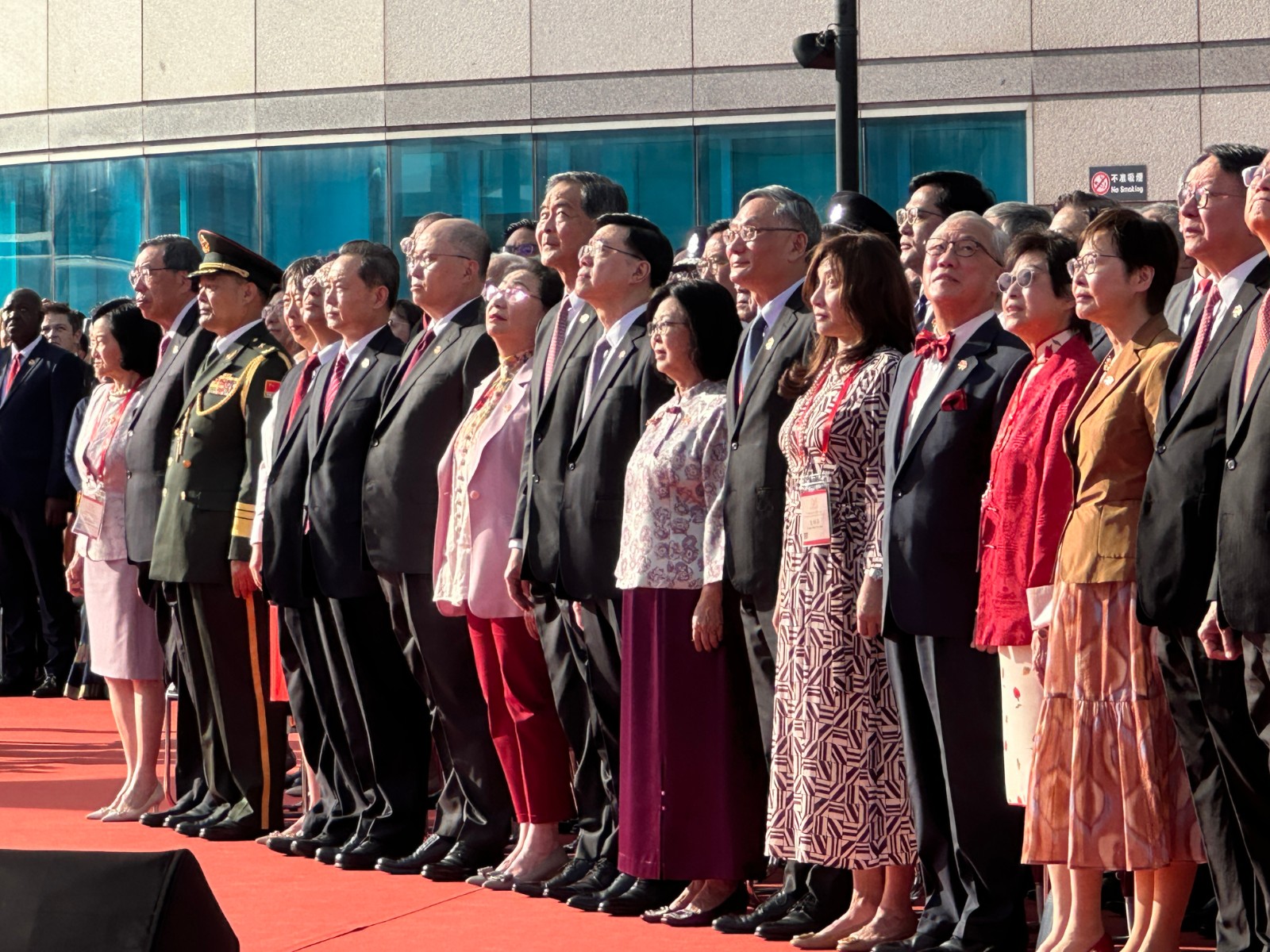 出席升旗儀式的嘉賓合影留念。記者 木子攝