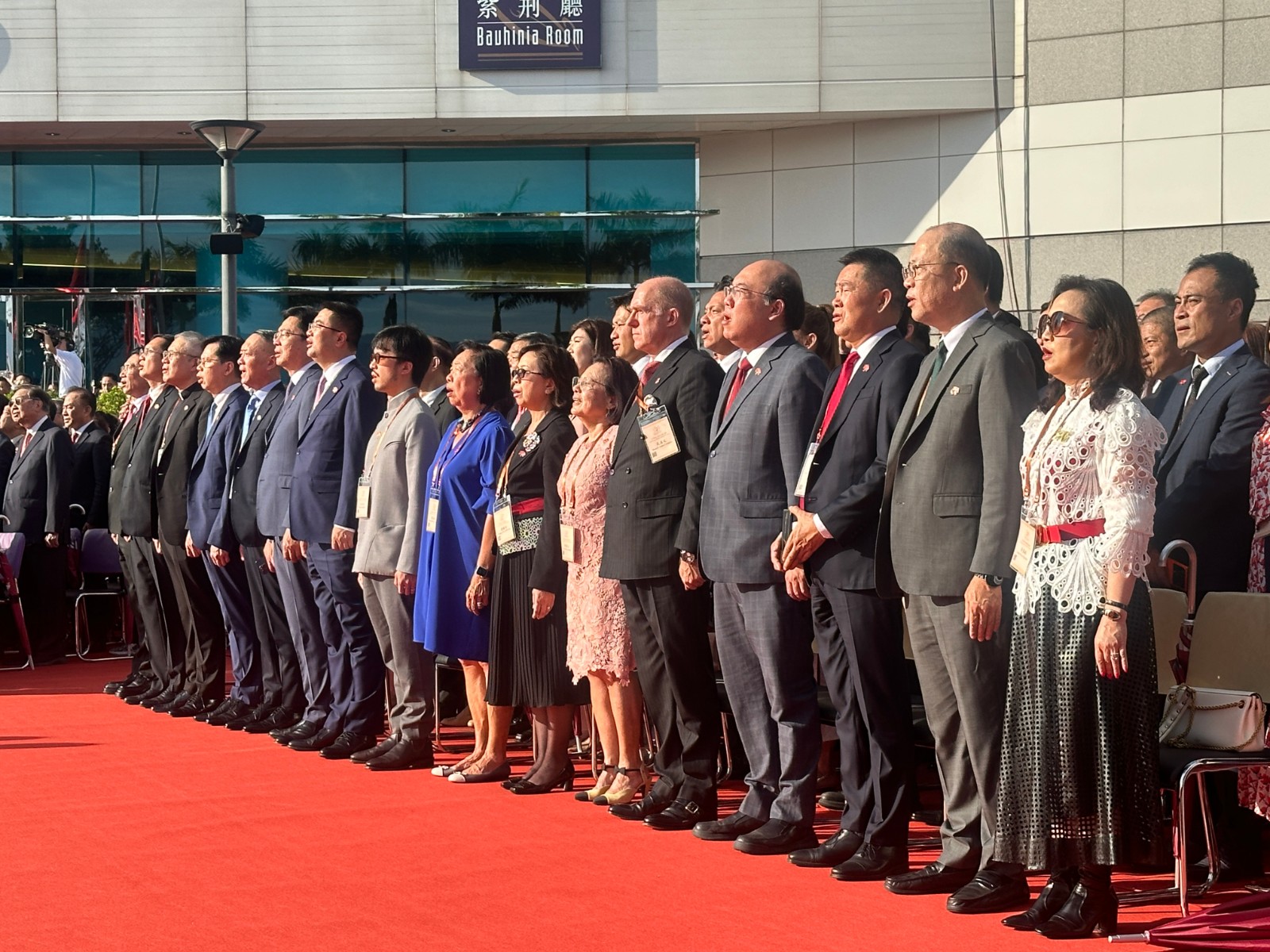 行政長官李家超(前排左六)等嘉賓齊唱國歌。圖:中新社
