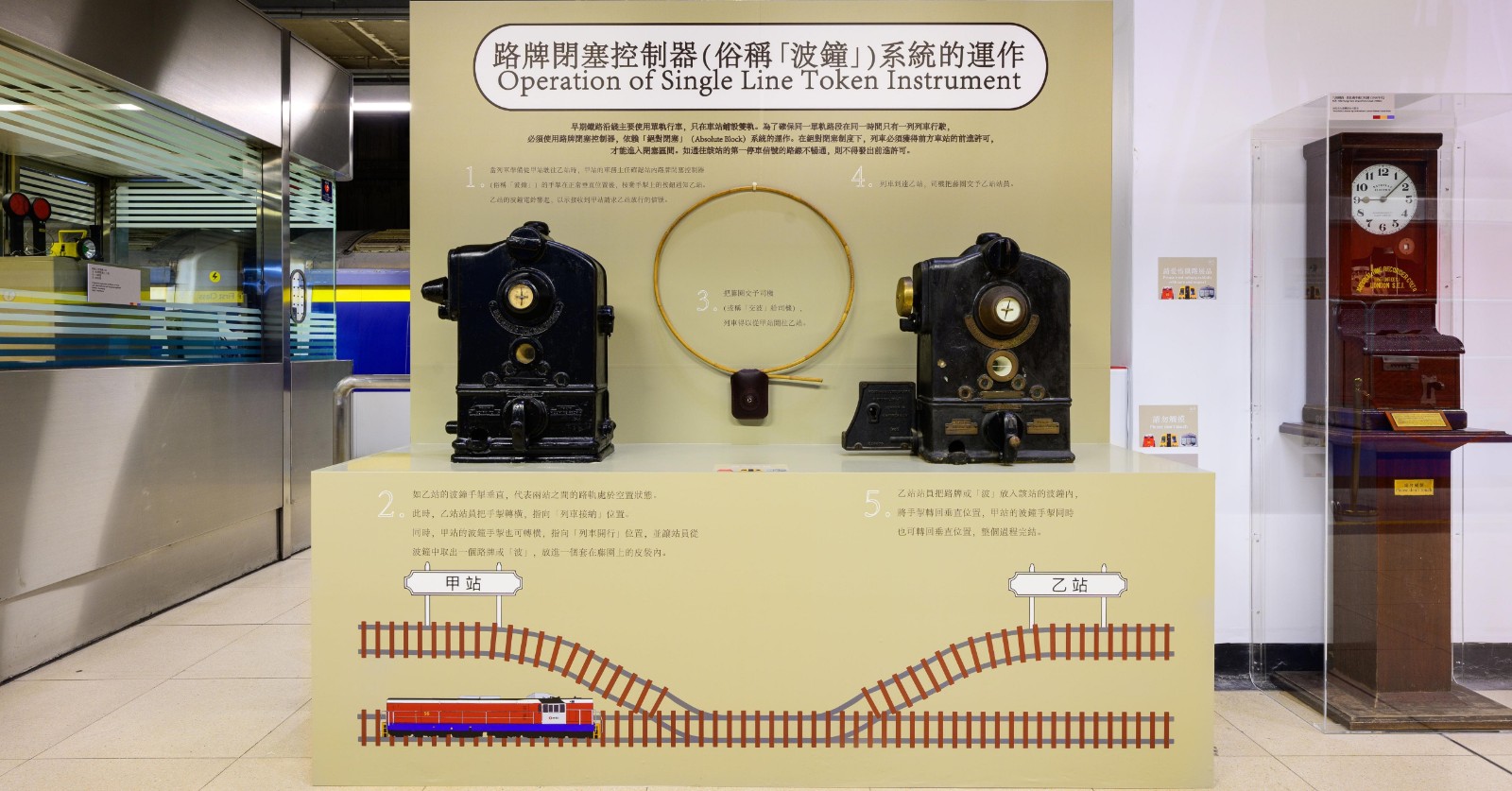 為進一步豐富展覽內(nèi)容,港鐵藉今日這個特別日子,增添3項新展品,包括第一代車務(wù)運作模擬系統(tǒng),路牌閉塞控制器(俗稱「波鐘」)系統(tǒng)的運作,以及將原有的現(xiàn)代化列車車頭更換為具有紅白色標(biāo)誌性設(shè)計的第一代載客列車車頭。