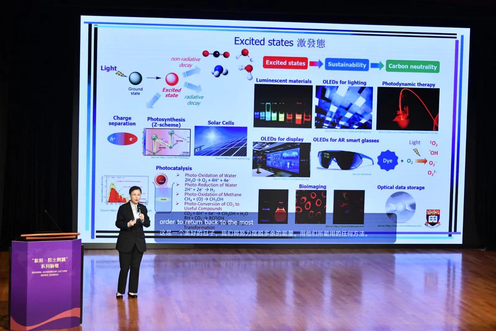 「紫荊·院士開講」有三位院士分享。圖為任詠華講解OLED應(yīng)用。蔡啟文攝