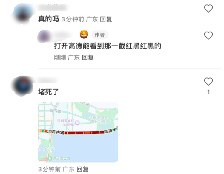下午1點(diǎn)35分,導(dǎo)航地圖上仍顯示該路段為嚴(yán)重?fù)矶聽(tīng)顟B(tài)。建議需要途經(jīng)的車(chē)友繞道行駛,或繞至濱海大道深灣五輔道轉(zhuǎn)深南大道行駛。(深圳特區(qū)報(bào)綜合自深圳衛(wèi)視深視新聞、第一現(xiàn)場(chǎng)、深圳新聞網(wǎng))