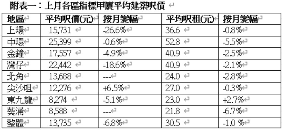 甲廈售價(jià)大跌,美聯(lián)工商舖資料研究部發(fā)表報(bào)告指出,9月指標(biāo)甲廈售價(jià)按月下跌約6.8%。由於上月有數(shù)宗甲廈物業(yè)皆以低價(jià)錄得成交,令上環(huán)、金鐘及灣仔的平均甲廈售價(jià)大幅下跌,拖累整體甲廈的表現(xiàn)。