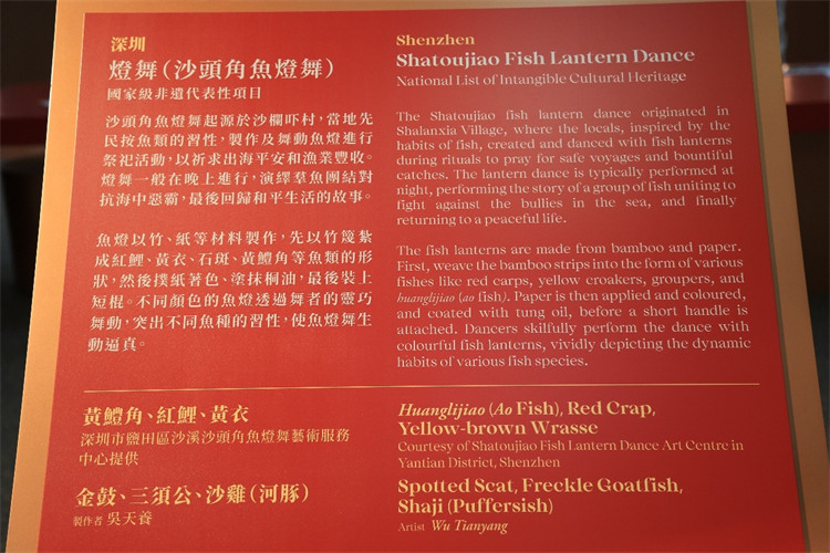除此以外,由鹽田區(qū)區(qū)級非遺沙頭角吳氏魚燈製作技藝代表性傳承人吳天養(yǎng)老師手製傳統(tǒng)魚燈作品也作為深圳非遺代表,與粵繡、廣彩等大灣區(qū)非遺精品一同在展覽中展出。本次展覽是首個以大灣區(qū)非物質(zhì)文化遺產(chǎn)為主題的聯(lián)合巡迴展覽,首站定於香港,隨後將在深圳和澳門展出,展覽將從2024年10月19日至2025年3月31日,以象徵吉祥如意的瑞獸為主題,通過實物展品、圖文展板、視頻節(jié)目等形式,向香港市民介紹大灣區(qū)11個城市的傳統(tǒng)舞蹈、傳統(tǒng)技藝、節(jié)慶習俗等非物質(zhì)文化遺產(chǎn)項目,展現(xiàn)匠人的精湛技藝和深厚的文化底蘊。(記者 :羅國淮)