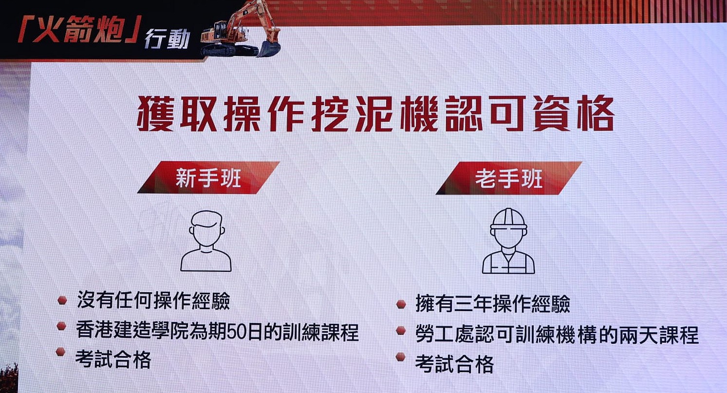 根據(jù)法律規(guī)定,無任何操作挖泥機經(jīng)驗的人士,必需參加香港建造學院開辦為期50日的訓練課程,俗稱「新手班」;而操作挖泥機滿3年經(jīng)驗人士,包括境外經(jīng)驗,可參加勞工處認可訓練課程營辦機構(gòu)舉辦的俗稱「老手班」兩天課程,並考試合格才獲有效證書。