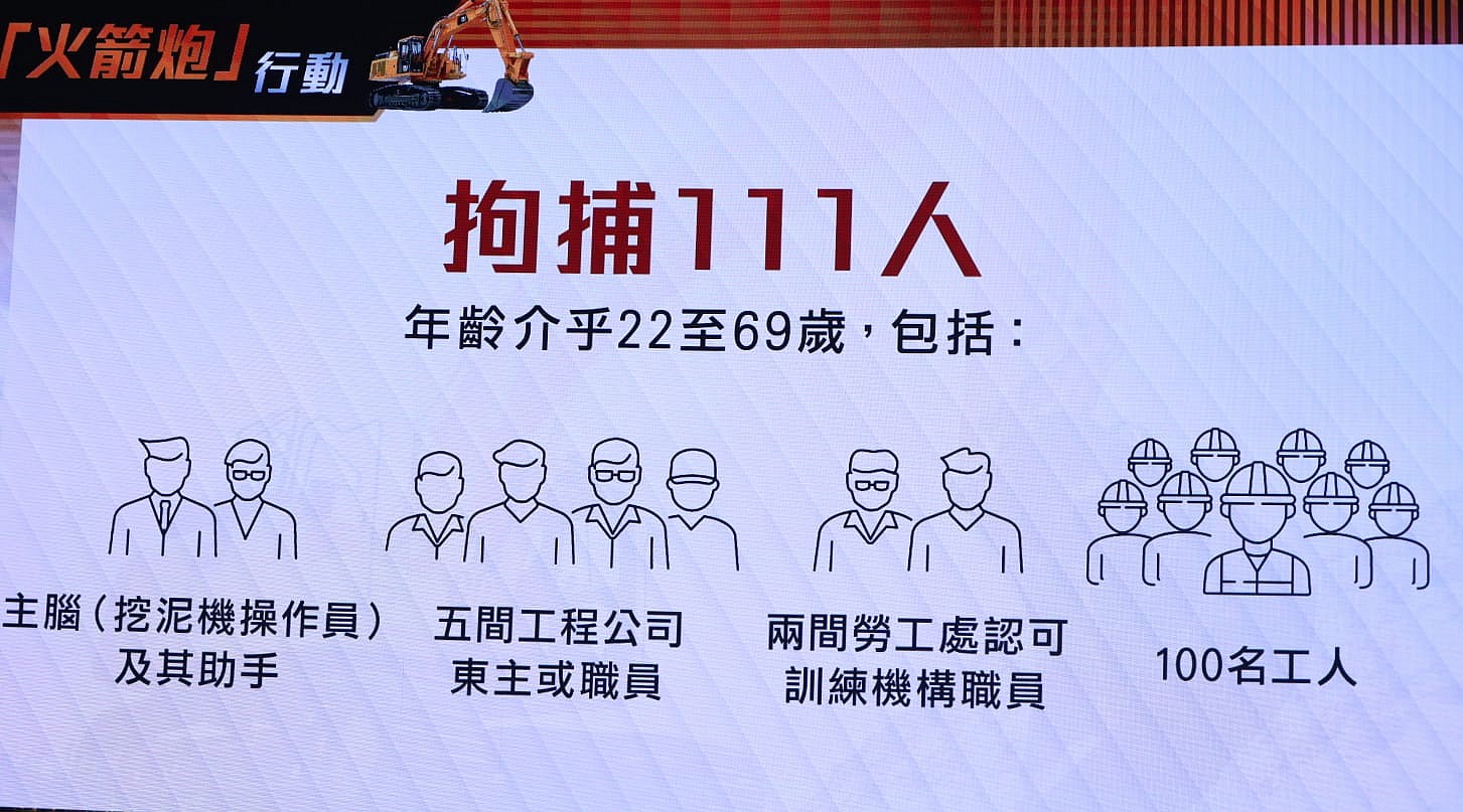 被捕人士包括111名建造業(yè)相關(guān)人士及37名電力工程相關(guān)人士,所有人已獲得保釋,調(diào)查繼續(xù)進行。
