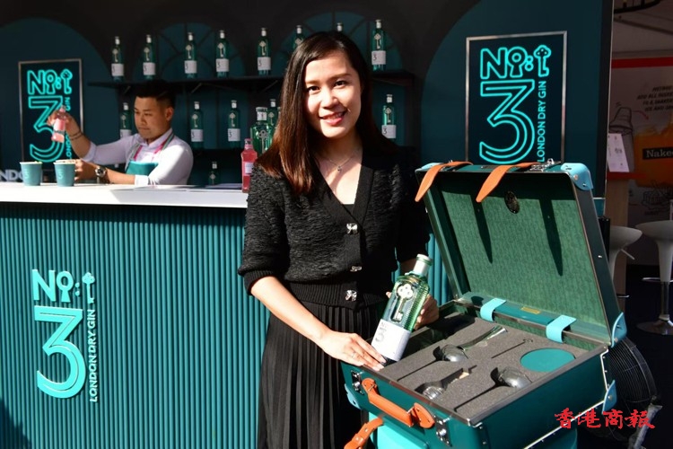 愛丁頓香港洋酒有限公司高級品牌經(jīng)理張慧婷介紹攤位售賣的酒類飲品。(記者 崔俊良攝)