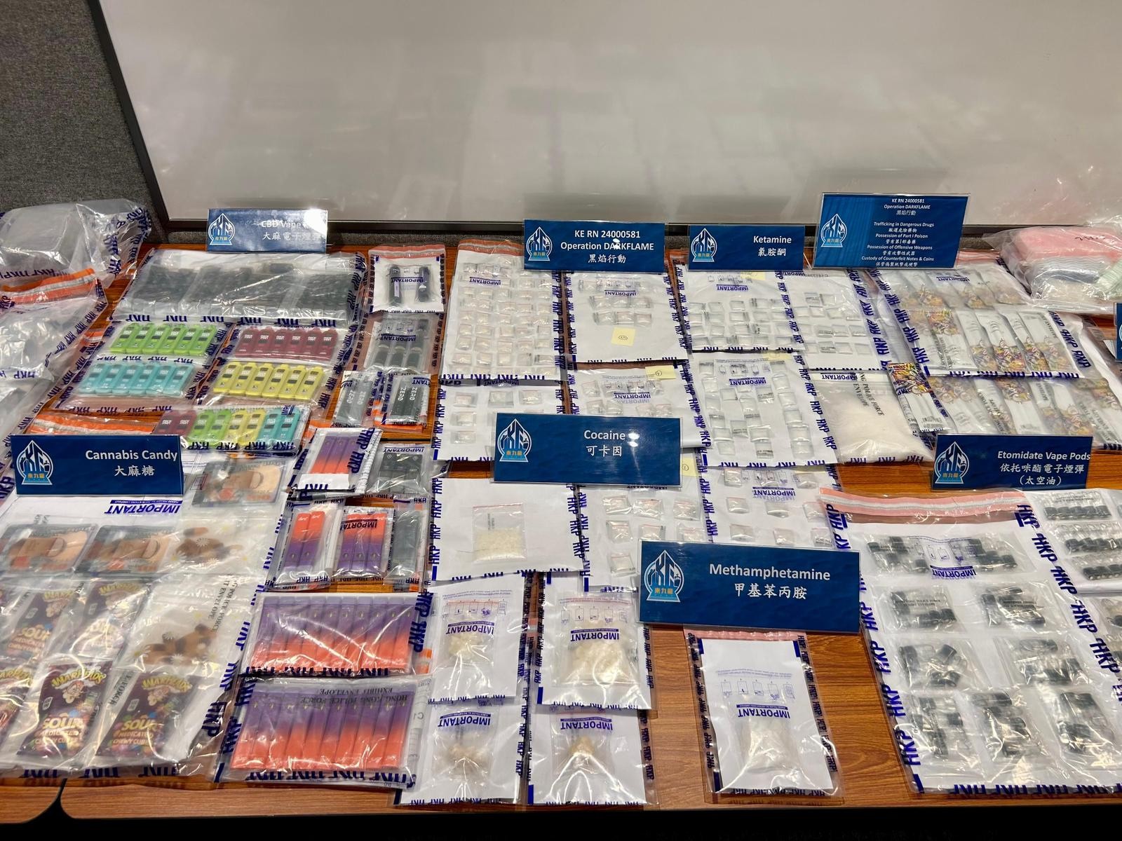 警方展開(kāi)代號(hào)「黑焰」反毒品行動(dòng),搗破一個(gè)活躍於九龍區(qū)的販毒集團(tuán),檢獲約2.8公斤大麻花、氯胺酮、可卡因、冰毒等毒品,約值110萬(wàn)元,拘捕5人。