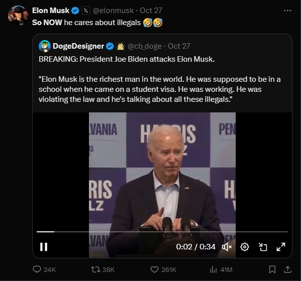 對(duì)此,馬斯克回應(yīng)稱,「事實(shí)上,我被允許在美國工作?!顾€在社交媒體上轉(zhuǎn)發(fā)了一則拜登講話的視頻帖文,並諷刺稱,「所以,現(xiàn)在他開始關(guān)心非法移民了。」
