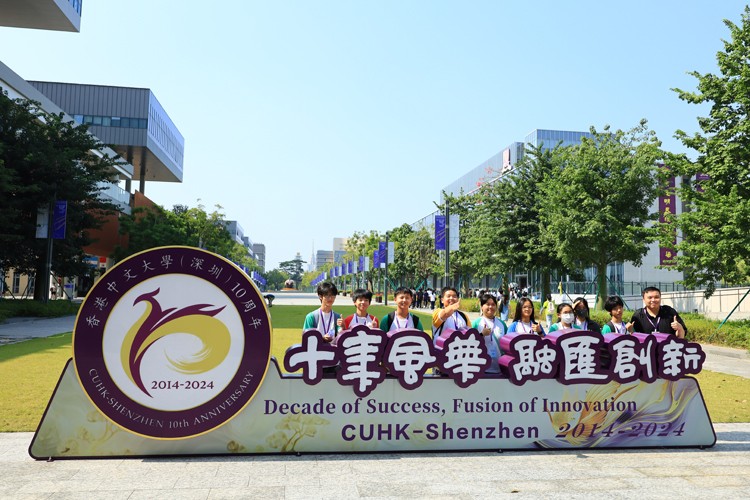 學(xué)生於香港中文大學(xué)(深圳)的十周年紀(jì)念牌留影。
