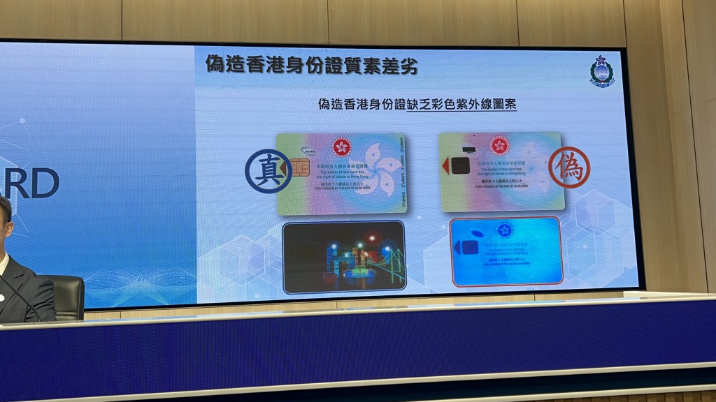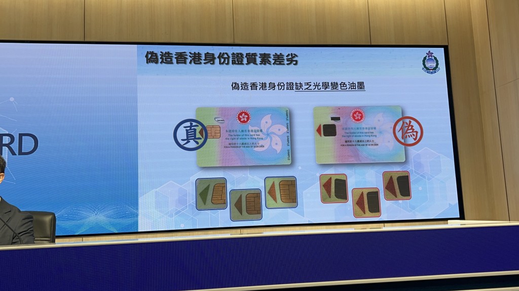 入境處提到,行動中所檢獲的全部假身份證質(zhì)素差劣,欠缺防僞特徵,與真正的香港身份證比較,不難分辨。例如真正身份證相片側(cè)邊,會有三朵紫荊花全息圖像,假證則沒有;真正身份證背面在紫外線照射下,會顯示彩色維港及青馬大橋煙花圖,假證亦沒有;真正身份證背面有一個光學(xué)變色油墨印刷而成的三角形圖案,可以隨觀察角度轉(zhuǎn)變,由紅色變成綠色,假證同樣沒有。